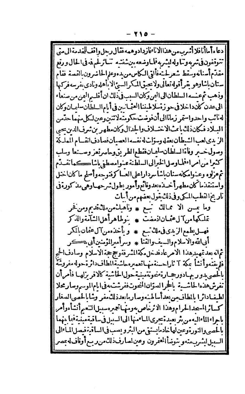 دَعَاهُ أما أَنا فَلَا أشْرب من هَذَا الْإِنَاء فازداد وهمه فَقَالَ رجل وَاقِف للْخدمَة إِلَى مَتى تتوقفون فِي شربه وتناوله ليشربه فَلَمَّا وَضعه بَين شَفَتَيْه تناثر لحم فَمه فِي الْحَال وَوَقع مقدم أَسْنَانه وَسقط شعر لحيته فَألْقى الكاس من يَده وَعلم الْحَاضِرُونَ بالقصة فَقَامَ سِنَان باشا وَهُوَ يقْرَأ قَوْله تَعَالَى وَلَا يَحِيق الْمَكْر السيء إِلَّا بأَهْله ونادى بفرسه فركبها وَذهب ثمَّ عينه السُّلْطَان إِلَى الْيمن وَكَانَ السَّبَب فِي ذَلِك أَن إقليم الْيمن من صنعاء إِلَى عدن كَانَ دَاخِلا فِي حوزة سلاطيننا العثمانيين فِي أَيَّام السُّلْطَان سُلَيْمَان وَكَانَ لَهُ نَائِب وَاحِد وَاسْتمرّ زَمَانا إِلَى أَن فوضت حكومته لاثْنَيْنِ وَعين لكل مِنْهُمَا مَا حدّ من الْبِلَاد فَكَانَ ذَلِك باعث الِاخْتِلَاف والجدال وَكَانَ مطهر بن شرف الدّين يحيى الزيدي لعب الشَّيْطَان بعقله وسولت لَهُ نَفسه الْعِصْيَان فصادف انقسام المملكة وُصُول خبر وَفَاة السُّلْطَان سُلَيْمَان فَقطع الطَّرِيق وحاصر تعز وصنعا وسلب كثيرا من أُمَرَاء فَلَمَّا وصل الْخَبَر إِلَى السلطنة عينوا مصطفى باشا كَمَا تقدم ثمَّ عزلوه وعينوا مَكَانَهُ سِنَان باشا سردار على العساكر فَتوجه وَأصْلح مَا كَانَ اخْتَلَّ واستنقذ مَا كَانَ مطهر أَخذه بعد وقائع وَأُمُور يطول شرحها وَهِي مَذْكُورَة فِي تَارِيخ القطب الْمَكِّيّ وَفِي ذَلِك يَقُول بَعضهم من أَبْيَات