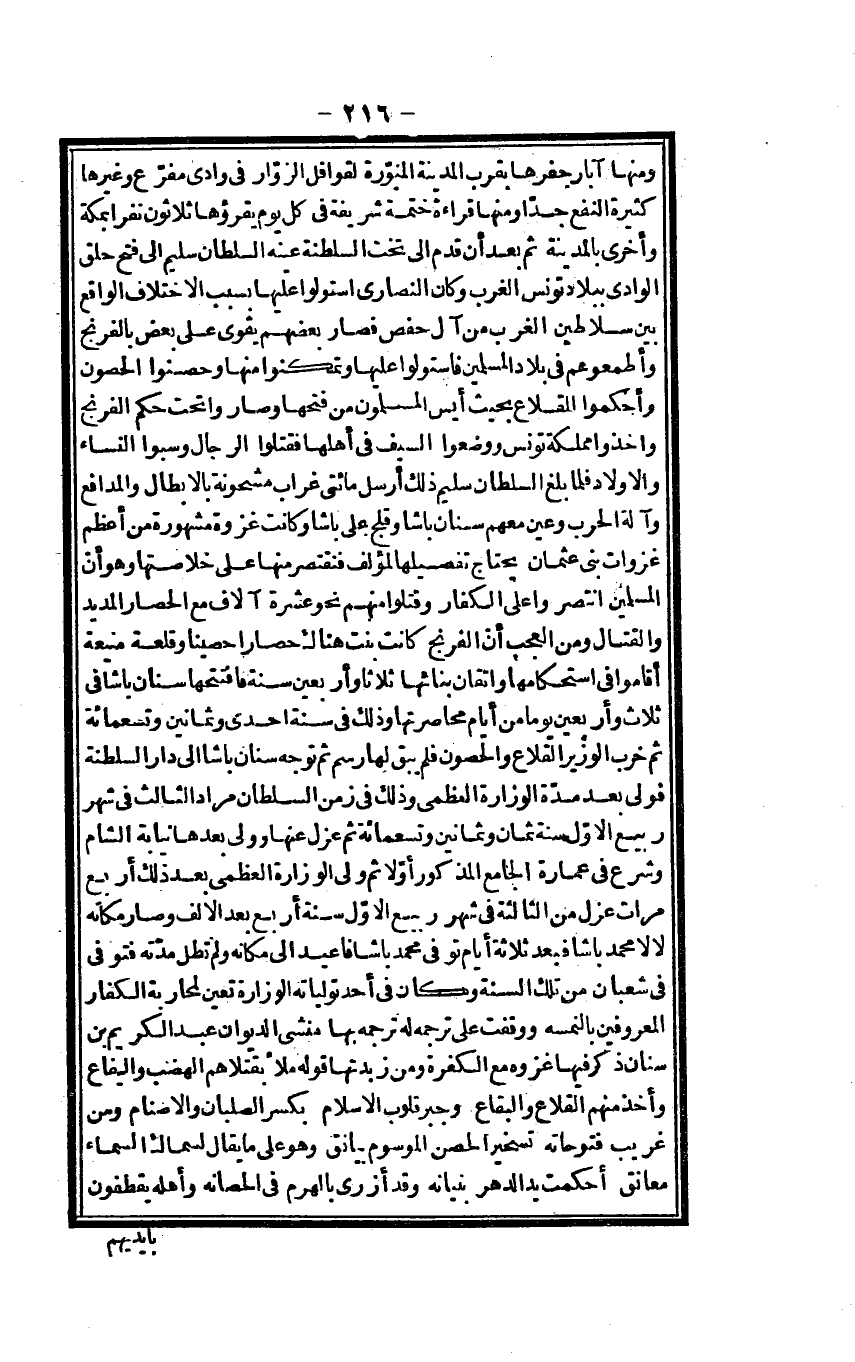 وَمِنْهَا آبار حفرهَا بِقرب الْمَدِينَة المنورة لقوافل الزوار فِي وَادي مُفَرع وَغَيرهَا كَثِيرَة النَّفْع جدا وَمِنْهَا قِرَاءَة ختمة شريفة فِي كل يَوْم يقْرؤهَا ثَلَاثُونَ نَفرا بِمَكَّة وَأُخْرَى بِالْمَدِينَةِ ثمَّ بعد أَن قدم إِلَى تخت السلطنة عينه السُّلْطَان سليم إِلَى فتح حلق الْوَادي بِبِلَاد تونس الغرب وَكَانَ النَّصَارَى استولوا عَلَيْهَا بِسَبَب الِاخْتِلَاف الْوَاقِع بَين سلاطين الغرب من آل حَفْص فَصَارَ بَعضهم يقوى على بعض بالفرنج وأطمعوهم فِي بِلَاد الْمُسلمين فاستولوا عَلَيْهَا وتمكنوا مِنْهَا وحصنوا الْحُصُون وأحكموا المقلاع بِحَيْثُ أيس الْمُسلمُونَ من فتحهَا وصاروا تَحت حكم الفرنج وَأخذُوا مملكة تونس وَوَضَعُوا السَّيْف فِي أَهلهَا فَقتلُوا الرِّجَال وَسبوا النِّسَاء وَالْأَوْلَاد فَلَمَّا بلغ السُّلْطَان سليم ذَلِك أرسل مِائَتي غراب مشحونة بالأبطال والمدافع وَآلَة الْحَرْب وَعين مَعَهم سِنَان باشا وقلج عَليّ باشا وَكَانَت غَزْوَة مَشْهُورَة من أعظم غزوات بني عُثْمَان يحْتَاج إِلَى تفصيلها الْمُؤلف فنقتصر مِنْهَا على خلاصتها وَهُوَ أَن الْمُسلمين انتصروا على الْكفَّار وَقتلُوا مِنْهُم نَحْو عشرَة آلَاف مَعَ الْحصار المديد والقتال وَمن الْعجب أَن الفرنج كَانَت بنت هُنَاكَ حصاراً حصيناً وقلعة منيعة أَقَامُوا فِي استحكامها وإتقان بنائها ثَلَاثًا وَأَرْبَعين سنة فافتتحها سِنَان باشا فِي ثَلَاث وَأَرْبَعين يَوْمًا من أَيَّام محاصرتها وَذَلِكَ فِي سنة إِحْدَى وَثَمَانِينَ وَتِسْعمِائَة ثمَّ خرب الْوَزير القلاع والحصون فَلم يبْق لَهَا رسم ثمَّ توجه سِنَان باشا إِلَى دَار السلطنة فولى بعد مُدَّة الوزارة الْعُظْمَى وَذَلِكَ فِي زمن السُّلْطَان مُرَاد الثَّالِث فِي شهر ربيع الأول سنة ثَمَان وَثَمَانِينَ وَتِسْعمِائَة ثمَّ عزل عَنْهَا وَولي بعْدهَا نِيَابَة الشَّام وَشرع فِي عمَارَة الْجَامِع الْمَذْكُور أَولا ثمَّ ولي الوزارة الْعُظْمَى بعد ذَلِك أَربع مَرَّات عزل من الثَّالِثَة فِي شهر ربيع الأول سنة أَربع بعد الْألف وَصَارَ مَكَانَهُ لالا مُحَمَّد باشا فَبعد ثَلَاثَة أَيَّام توفّي مُحَمَّد باشا فأعيد إِلَى مَكَانَهُ وَلم تطل مدَّته فَتوفي فِي شعْبَان من تِلْكَ السّنة وَكَانَ فِي أحد تولياته الوزارة تعين لمحاربة الْكفَّار المعروفين بالنمسة ووقفت على تَرْجَمَة لَهُ تَرْجَمَة بهَا منشيء الدِّيوَان عبد الْكَرِيم بن سِنَان ذكر فِيهَا غَزوه مَعَ الْكَفَرَة وَمن زبدتها قَوْله مَلأ بقتلاهم الهضب وَالْبِقَاع وَأخذ مِنْهُم القلاع وَالْبِقَاع وجبر قُلُوب الْإِسْلَام بِكَسْر الصلبان والأصنام وَمن غَرِيب فتوحاته تسخيراً لحصن الموسوم بيانق وَهُوَ على مَا يُقَال لسماك السَّمَاء معانق أحكمت يَد الدَّهْر بُنْيَانه وَقد أزرى بالهرم فِي الحصانه وَأَهله يقطفون