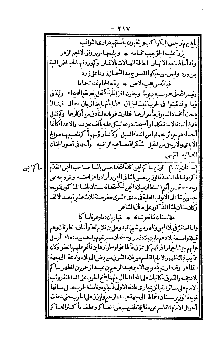 سِنَان باشا الْوَزير حَاكم الْيمن كَانَ كتخدا حسن باشا صَاحب الْيمن الْمُقدم ذكره وَلما طَالَتْ مُدَّة الْوَزير حسن باشا فِي الْيمن وَأَرَادُوا عَزله مِنْهُ وَخُرُوجه على وَجه مستحسن أنعم السُّلْطَان بِبِلَاد الْيمن لكتخدانه سِنَان باشا الْمَذْكُور فَتوجه حسن باشا إِلَى الْأَبْوَاب الْعلية فِي حادي عشري صفر سنة ثَلَاث عشرَة بعد الْألف وَكَانَ سِنَان باشا الْمَذْكُور على مَا قَالَ الشَّاعِر