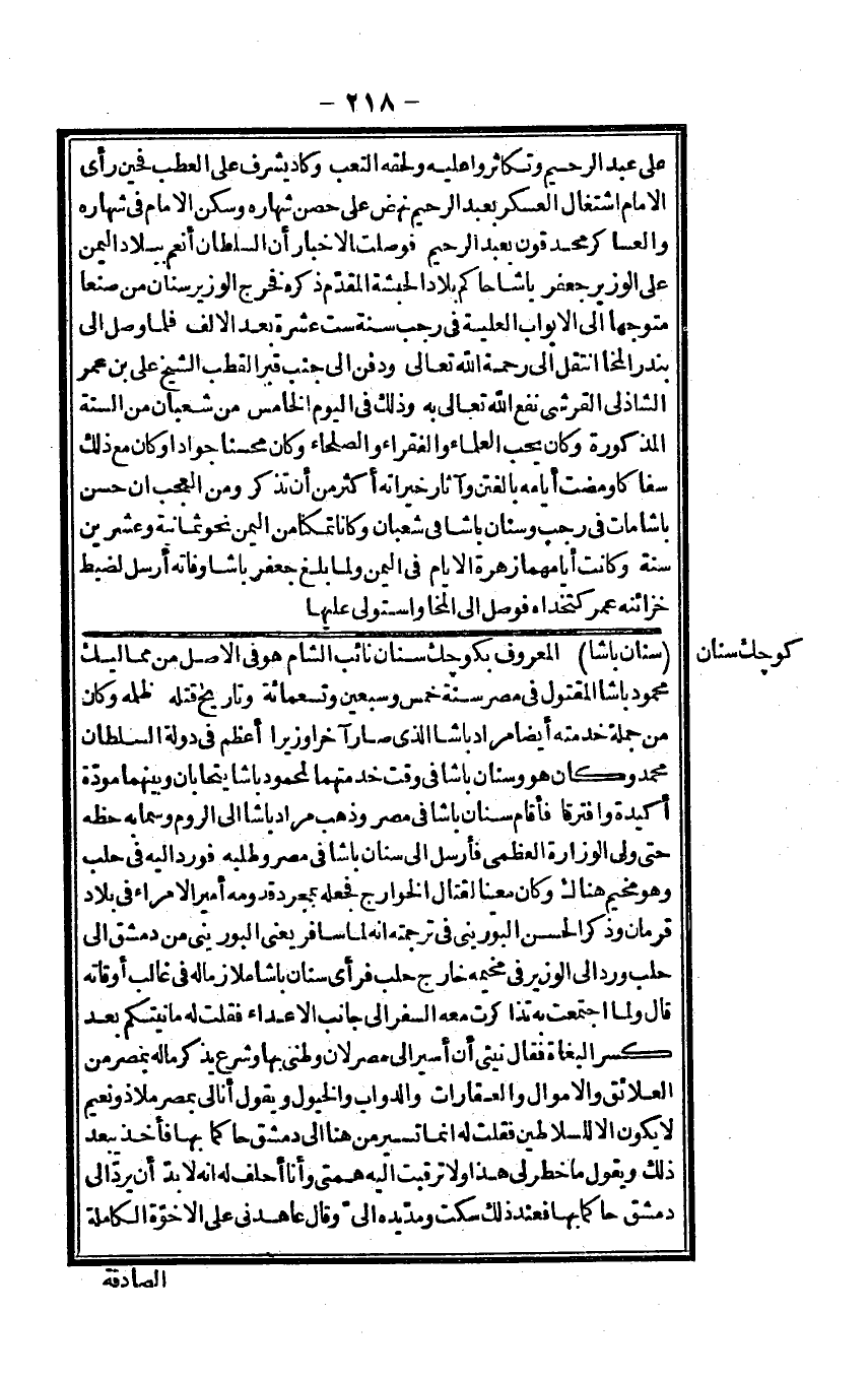 على عبد الرَّحِيم وتكاثروا عَلَيْهِ ولحقه التَّعَب وَكَاد يشرف على العطب فحين رأى الإِمَام اشْتِغَال الْعَسْكَر بِعَبْد الرَّحِيم نَهَضَ على حصن شهاره وَسكن الإِمَام فِي شهاره والعساكر محدقون بِعَبْد الرَّحِيم فوصلت الْأَخْبَار أَن السُّلْطَان أنعم بِبِلَاد الْيمن على الْوَزير جَعْفَر باشا حَاكم بِلَاد الْحَبَشَة الْمُقدم ذكره فَخرج الْوَزير سِنَان من صنعا مُتَوَجها إِلَى الْأَبْوَاب الْعلية فِي رَجَب سنة سِتّ عشرَة بعد الْألف فَلَمَّا وصل إِلَى بندر المخا انْتقل إِلَى رَحْمَة الله تَعَالَى وَدفن إِلَى جَانب قبر القطب الشَّيْخ عَليّ بن عمر الشاذلي الْقرشِي نفع الله تَعَالَى بِهِ وَذَلِكَ فِي الْيَوْم الْخَامِس من شعْبَان من السّنة الْمَذْكُورَة وَكَانَ يحب الْعلمَاء والفقراء والصلحاء وَكَانَ محسناً جواداً وَكَانَ مَعَ ذَلِك سفاكاً وَمَضَت أَيَّامه بالفتن وآثار خيراته أَكثر من أَن تذكر وَمن الْعجب أَن حسن باشا مَاتَ فِي رَجَب وَسنَان باشا فِي شعْبَان وَكَانَا تمَكنا من الْيمن نَحْو ثَمَانِيَة وَعشْرين سنة وَكَانَت أيامهما زهرَة الْأَيَّام فِي الْيمن وَلما بلغ جَعْفَر باشا وَفَاته أرسل لضبط خزائنه عمر كتخداء فوصل إِلَى المخا وَاسْتولى عَلَيْهَا