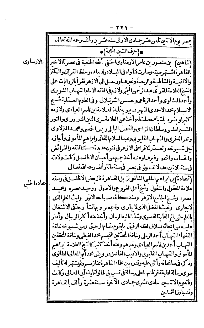 شاهين بن مَنْصُور بن عَامر الأرمناوي الْحَنَفِيّ أفقه الْحَنَفِيَّة فِي عصرنا الْأَخير بِالْقَاهِرَةِ اشْتهر صيته وسارت فَتَاوَاهُ فِي الْبِلَاد وَولد بِبَلَدِهِ وَحفظ الْقُرْآن والكنز والألفية والشاطبية والرحبية وَغَيرهَا ورحل إِلَى الْأَزْهَر فَقَرَأَ بالروايات على الشَّيْخ الْعَلامَة المقرى عبد الرَّحْمَن اليمني ولازم فِي الْفِقْه الإِمَام الشهَاب الشَّوْبَرِيّ وَأحمد المنشاوي وَأحمد الرِّفَاعِي وَحسن الشُّرُنْبُلَالِيّ وَفِي الْعُلُوم الْعَقْلِيَّة شيخ الْإِسْلَام مُحَمَّد الأحمدي الشهير بسيبويه تلميذ الْعَلامَة ابْن قَاسم الْعَبَّادِيّ ولازمه كثيرا وبشره بأَشْيَاء حصلت لَهُ وَأخذ عَن الْعَلامَة سري الدّين الدروري والنور الشبراملسي وسلطان المزاحي وَالشَّمْس البابلي وَيس الْحِمصِي وَمُحَمّد المنزلاوي وَعمر الدفري والشهاب القليوبي وَعبد السَّلَام اللَّقَّانِيّ وَإِبْرَاهِيم المأموني وَأَجَازَهُ جلّ شُيُوخه وتصدّر للإقراء فِي الْأَزْهَر فِي فنون عديدة كالفقه والفرائض والحساب والنحو وَغَيرهَا وَعنهُ أَخذ جمع من أَعْيَان الأفاضل وَكَانَت وِلَادَته فِي سنة ثَلَاثِينَ بعد الْألف وَتُوفِّي بِمصْر فِي سنة مائَة وَألف رَحمَه الله تَعَالَى