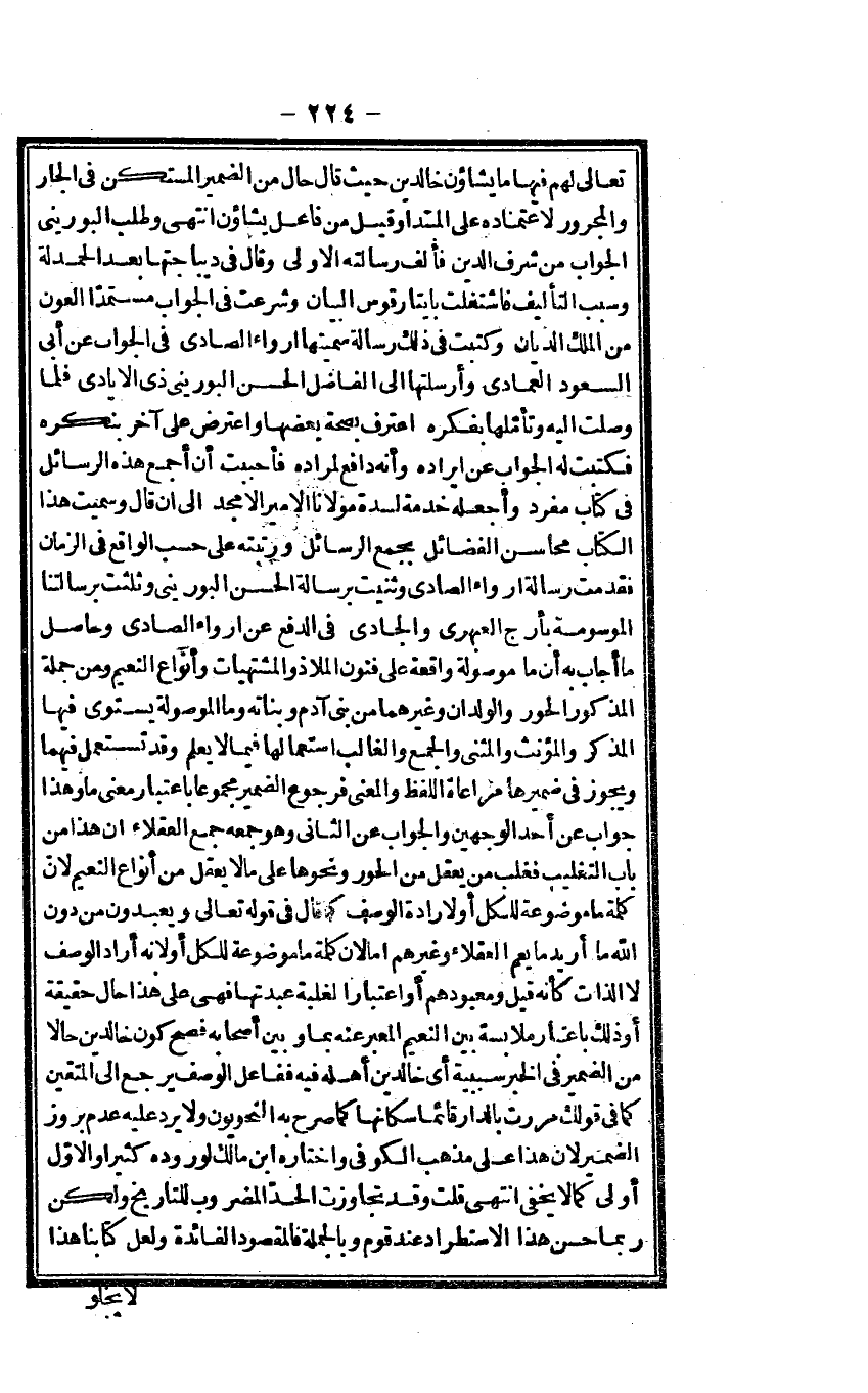 تَعَالَى لَهُم فِيهَا مَا يشاؤن خَالِدين حَيْثُ قَالَ حَال من الضَّمِير المستكن فِي الْجَار وَالْمَجْرُور لاعتماده على الْمُبْتَدَأ وَقيل من فَاعل يشاؤون انْتهى وَطلب البوريني الْجَواب من شرف الدّين فألف رسَالَته الأولى وَقَالَ فِي ديباجتها بعد الحمدلة وَسبب التَّأْلِيف فاشتغلت بايتارقوس الْبَيَان وشرعت فِي الْجَواب مستمدا العون من الْملك الديَّان وكتبت فِي ذَلِك رِسَالَة سميتها ارواء الصادي فِي الْجَواب عَن أبي السُّعُود الْعِمَادِيّ وأرسلتها إِلَى الْفَاضِل الْحسن البوريني ذِي الأيادي فَلَمَّا وصلت إِلَيْهِ وتأملها بفكره اعْترف بِصِحَّة بَعْضهَا وَاعْترض على آخر بنكره فَكتبت لَهُ الْجَواب عَن إِيرَاده وَأَنه دَافع لمراده فَأَحْبَبْت أَن أجمع هَذِه الرسائل فِي كتاب مُفْرد وأجعله خدمَة لسدة مَوْلَانَا الْأَمِير الأمجد إِلَى أَن قَالَ وَسميت هَذَا الْكتاب محَاسِن الْفَضَائِل بِجمع الرسائل ورتبته على حسب الْوَاقِع فِي الزَّمَان فَقدمت رِسَالَة إرواء الصادي وثنيت برسالة الْحسن البوريني وثلثت برسالتنا الموسومة بأرج العهري والجادي فِي الدّفع عَن إرواس الصادي وَحَاصِل مَا أجَاب بِهِ أَن مَا مَوْصُولَة وَاقعَة على فنون الملاذ والمشتهيات وأنواع النَّعيم وَمن جملَة الْمَذْكُور الْحور والولدان وَغَيرهمَا من بني آدم وَبنَاته وَمَا الموصولة يَسْتَوِي فِيهَا الْمُذكر والمؤنث والمثنى وَالْجمع وَالْغَالِب اسْتِعْمَالهَا فِيمَا لَا يعلم وَقد تسْتَعْمل فيهمَا وَيجوز فِي ضميرها مُرَاعَاة اللَّفْظ وَالْمعْنَى فرجوع الضَّمِير مجموعاً بِاعْتِبَار معنى مَا وَهَذَا جَوَاب عَن أحد الْوَجْهَيْنِ وَالْجَوَاب عَن الثَّانِي وَهُوَ جمعه جمع الْعُقَلَاء أَن هَذَا من بَاب التغليب فغلب من يعقل من الْحور وَنَحْوهَا على مَا لَا يعقل من أَنْوَاع النَّعيم لِأَن كلمة مَا مَوْضُوعَة للْكُلّ أَو لارادة الْوَصْف كَمَا قَالَ فِي قَوْله تَعَالَى ويعبدون من دون الله مَا أُرِيد مَا يعم الْعُقَلَاء وَغَيره أما لِأَن كلمة مَا مَوْضُوعَة للْكُلّ أَو لِأَنَّهُ أَرَادَ الْوَصْف لَا الذَّات كَأَنَّهُ قيل ومعبودهم أَو اعْتِبَار الْغَلَبَة عبدتها فَهِيَ على هَذَا حَال حَقِيقَة أَو ذَلِك بِاعْتِبَار مُلَابسَة بَين النَّعيم الْمعبر عَنهُ بماو بَين أَصْحَابه فصح كَون خَالِدين حَالا من الضَّمِير فِي الْخَبَر سَبَبِيَّة أَي خَالِدين أَهله فِيهِ ففاعل الْوَصْف يرجع إِلَى الْمُتَّقِينَ كَمَا فِي قَوْلك مَرَرْت بِالدَّار قَائِما سكانها كَمَا صرح بِهِ النحويون وَلَا يرد عَلَيْهِ عدم بروز الضَّمِير لِأَن هَذَا على مَذْهَب الْكُوفِي وَاخْتَارَهُ ابْن مَالك لوروده كثيرا وَالْأول أولى كَمَا لَا يخفى انْتهى قلت وَقد تجاززت الْحَد الْمَضْرُوب للتاريخ وَلَكِن رُبمَا حسن هَذَا الاستطراد عِنْد قوم وَبِالْجُمْلَةِ فالمقصود الْفَائِدَة وَلَعَلَّ كتَابنَا هَذَا