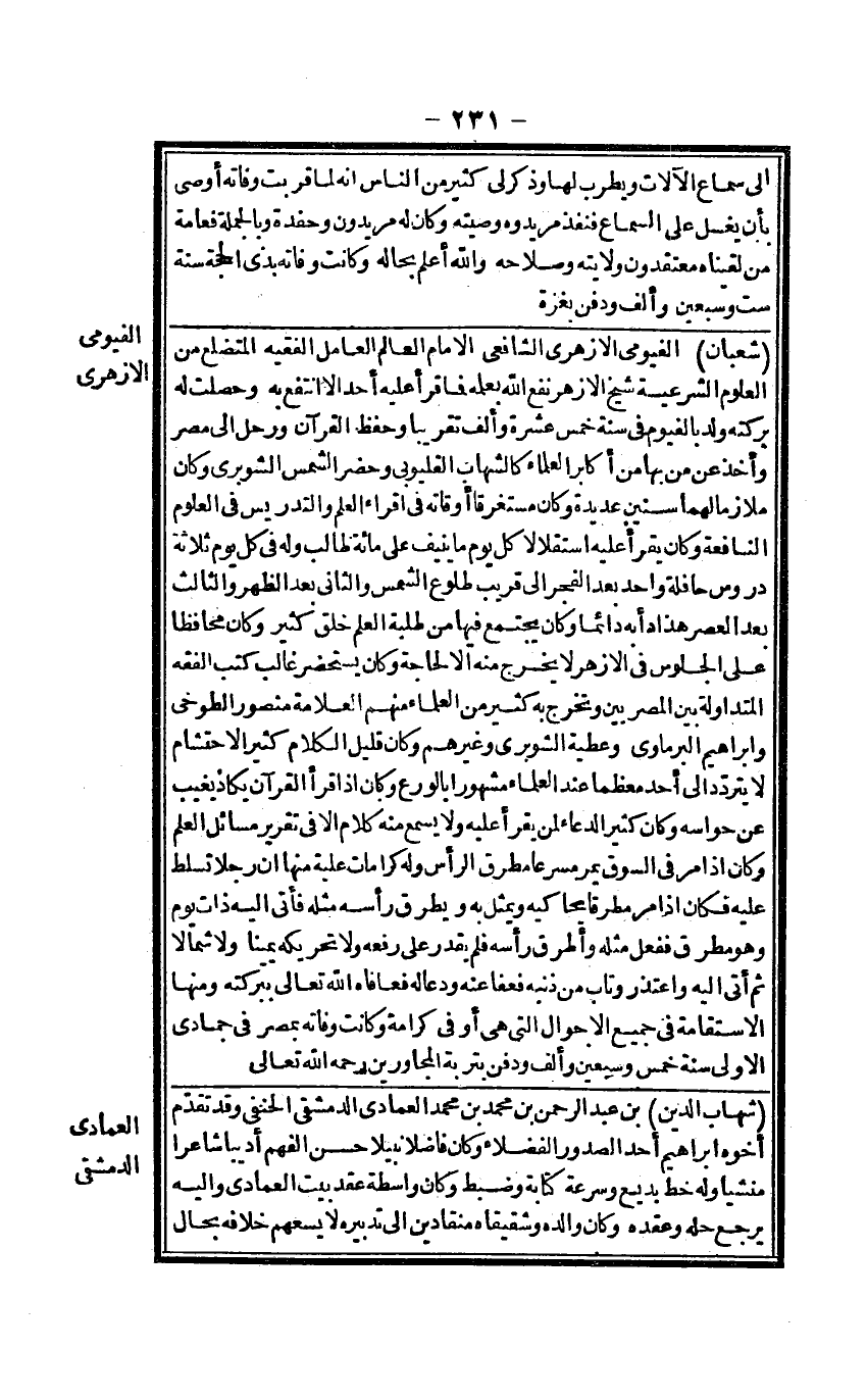 شعْبَان الفيومي الْأَزْهَرِي الشَّافِعِي الإِمَام الْعَالم الْعَامِل الْفَقِيه المتضلع من الْعُلُوم الشَّرْعِيَّة شيخ الْأَزْهَر نفع الله بِعِلْمِهِ فَمَا قَرَأَ عَلَيْهِ أحد إِلَّا انْتفع بِهِ وحصلت لَهُ بركته ولد بالفيوم فِي سنة خمس عشرَة وَألف تَقْرِيبًا وَحفظ الْقُرْآن ورحل إِلَى مصر وَأخذ عَن من بهَا من أكَابِر الْعلمَاء كالشهاب القليوبي وَحضر الشَّمْس الشَّوْبَرِيّ وَكَانَ ملازماً لَهما سِنِين عديدة وَكَانَ مُسْتَغْرقا أوقاته فِي إقراء الْعلم والتدريس فِي الْعُلُوم النافعة وَكَانَ يقْرَأ عَلَيْهِ اسْتِقْلَالا كل يَوْم مَا ينيف على مائَة طَالب وَله فِي كل يَوْم ثَلَاثَة دروس حافلة وَاحِدهَا بعد الْفجْر إِلَى قريب طُلُوع الشَّمْس وَالثَّانِي بعد الظّهْر وَالثَّالِث بعد الْعَصْر هَذَا دأبه دَائِما وَكَانَ يجْتَمع فِيهَا من طلبة الْعلم خلق كثير وَكَانَ محافظاً على الْجُلُوس فِي الْأَزْهَر لَا يخرج مِنْهُ إِلَّا لحَاجَة وَكَانَ يستحضر غَالب كتب الْفِقْه المتداولة بَين المصريين وَتخرج بِهِ كثير من الْعلمَاء مِنْهُم الْعَلامَة مَنْصُور الطوخي وَإِبْرَاهِيم الْبرمَاوِيّ وعطية الشَّوْبَرِيّ وَغَيرهم وَكَانَ قَلِيل الْكَلَام كثير الاحتشام لَا يتَرَدَّد إِلَى أحد مُعظما عِنْد الْعلمَاء مَشْهُورا بالورع وَكَانَ إِذا قَرَأَ الْقُرْآن يكَاد يغيب عَن حواسه وَكَانَ كثير الدُّعَاء لمن يقْرَأ عَلَيْهِ وَلَا يسمع مِنْهُ كَلَام إِلَّا فِي تَقْرِير مسَائِل الْعلم وَكَانَ إِذا مر فِي السُّوق يمر مسرعاً مطرق الرَّأْس وَله كرامات علية مِنْهَا أَن رجلا تسلط عَلَيْهِ فَكَانَ إِذا مر مطرقاً يحاكيه ويمثل بِهِ ويطرق رَأسه مثله فَأتى إِلَيْهِ ذَات يَوْم وَهُوَ مطرق فَفعل مثله وأطرق رَأسه فَلم يقدر على رَفعه وَلَا تحريكه يَمِينا وَلَا شمالاً ثمَّ أَتَى إِلَيْهِ وَاعْتذر وَتَابَ من ذَنبه فَعَفَا عَنهُ ودعا لَهُ فعافاه الله تَعَالَى ببركته وَمِنْهَا الاسْتقَامَة فِي جَمِيع الْأَحْوَال الَّتِي هِيَ أوفى كَرَامَة وَكَانَت وَفَاته بِمصْر فِي جُمَادَى الأولى سنة خمس وَسبعين وَألف وَدفن بتربة المجاورين رَحمَه الله تَعَالَى