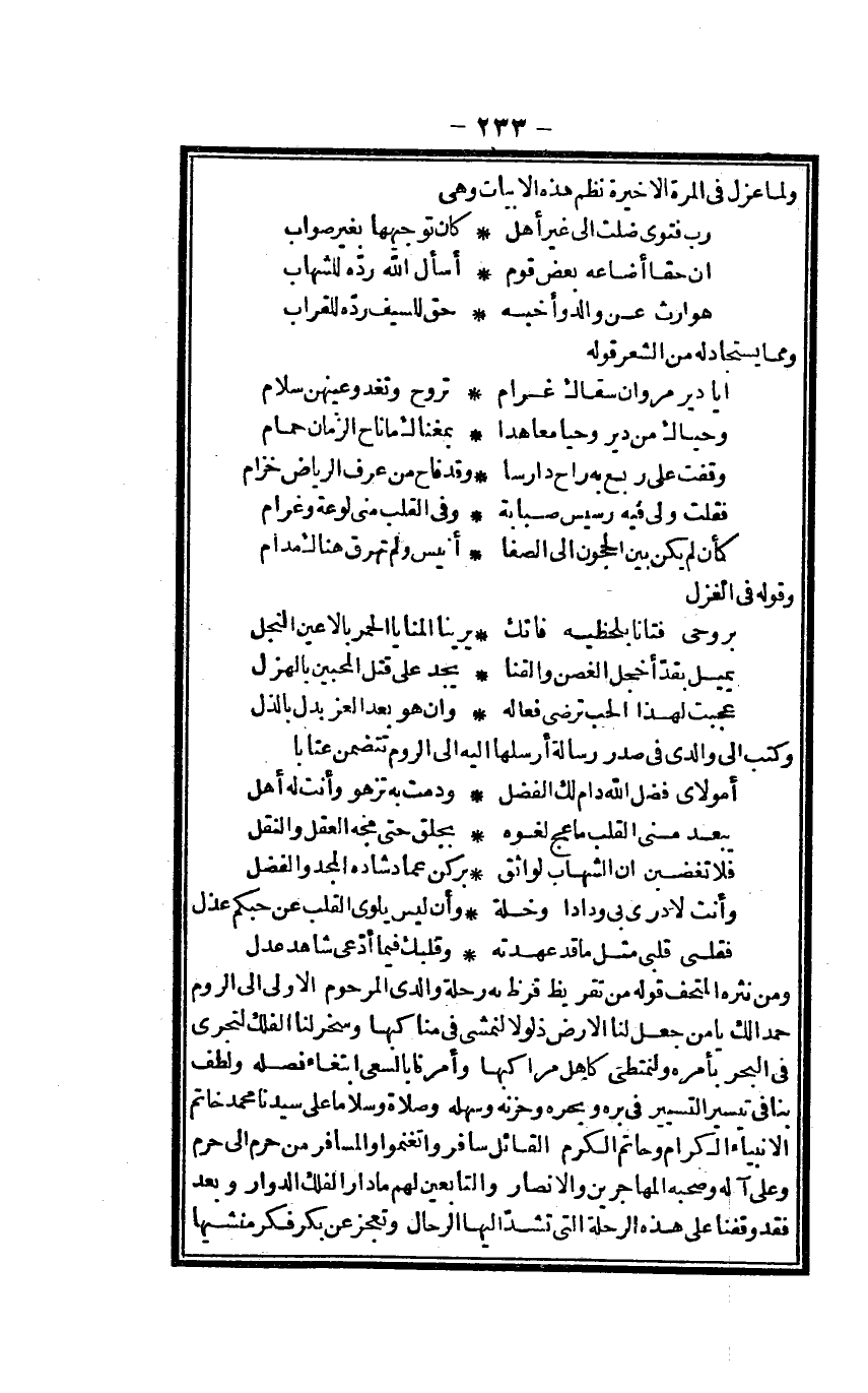 وَمن نثره المتحف قَوْله من تقريظ قرظ بِهِ رحْلَة وَالِدي المرحوم الأولى إِلَى الرّوم حمدا لَك يَا من جعل لنا الأَرْض ذلولا لنمشي فِي مناكبها وسخر لنا الْفلك لتجري فِي الْبَحْر بأَمْره ولنمطتي كَاهِل مراكبنا وأمرنا بالسعي ابْتِغَاء فَضله ولطف بِنَا فِي تيسير التسيير فِي بره وبحره وحزنه وسهله وَصَلَاة وَسلَامًا على سيدنَا مُحَمَّد خَاتم الْأَنْبِيَاء الْكِرَام وحاتم الْكَرم الْقَائِل سَافر واتغنموا وَالْمُسَافر من حرم إِلَى حرم وعَلى آله وَصَحبه الْمُهَاجِرين وَالْأَنْصَار وَالتَّابِعِينَ لَهُم مَا دَار الْفلك الدوار وَبعد فقد وقفنا على هَذِه الرحلة الَّتِي تشد إِلَيْهَا الرّحال وتعجز عَن بكر فكر منشيها