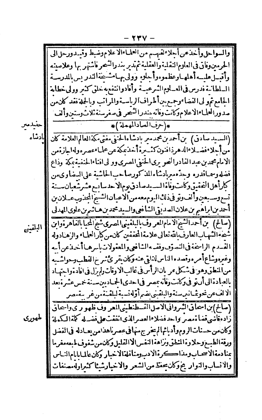 السَّيِّد صَادِق بن أَحْمد بن مُحَمَّد مير بادشاه الْحَنَفِيّ مفتي مَكَّة الْعَالم الْعَلامَة كَانَ من أجلاء فضلاء الدَّهْر ذَا فنون كَثِيرَة أَخذ بِمَكَّة عَن عُلَمَاء عصره وَله أجازة من الإِمَام مُحَمَّد بن عبد الْقَادِر النَّحْوِيّ يرى الْحَنَفِيّ الْمصْرِيّ وَولي إِفْتَاء الْحَنَفِيَّة بِمَكَّة وذاع فَضله وسما قدره وجده مير بادشاه الْمَذْكُور صَاحب الْحَاشِيَة على الْبَيْضَاوِيّ من كبار أهل التَّحْقِيق وَكَانَت وَفَاة السَّيِّد صَادِق يَوْم الْأَحَد سَابِع عشر شعْبَان سنة تسع وَسبعين وَألف وَتُوفِّي ذَلِك الْيَوْم مَعَه من الْأَعْيَان الشَّيْخ المجذوب عَلان بن أَحْمد بن إِبْرَاهِيم بن عَلان الصديقي الشَّافِعِي وَالسَّيِّد مُحَمَّد هَاشم بن علوي المهدلي