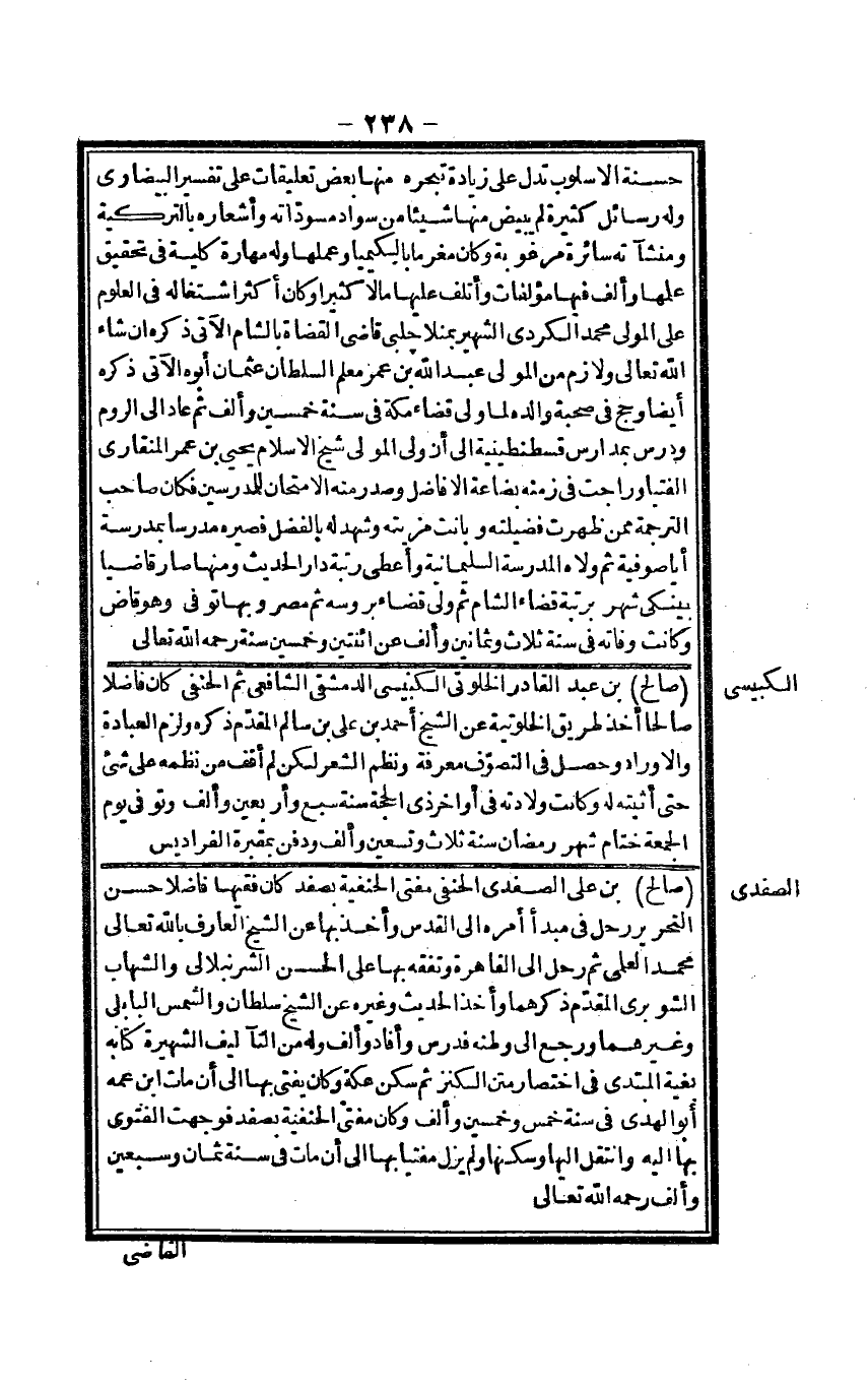 حَسَنَة الأسلوب تدل على زِيَادَة تبحره مِنْهَا بعض تعليقات على تَفْسِير الْبَيْضَاوِيّ وَله رسائل كَثِيرَة لم يبيض مِنْهَا شَيْئا من سَواد مسوداته وأشعاره بالتركية ومنشآته سائرة مرغوبة وَكَانَ مغرماً بالكيمياء وعملها وَله مهارة كُلية فِي تَحْقِيق علمهَا وَألف فِيهَا مؤلفات وأتلف عَلَيْهَا مَالا كثيرا وَكَانَ أَكثر اشْتِغَاله فِي الْعُلُوم على الْمولى مُحَمَّد الْكرْدِي الشهير بمنلا جلبي قَاضِي الْقُضَاة بِالشَّام الْآتِي ذكره إِن شَاءَ الله تَعَالَى ولازم من الْمولى عبد الله بن عمر معلم السُّلْطَان عُثْمَان أَبوهُ الْآتِي ذكره أَيْضا وَحج فِي صُحْبَة وَالِده لما ولي قَضَاء مَكَّة فِي سنة خمسين وَألف ثمَّ عَاد إِلَى الرّوم ودرس بمدارس قسطنطينية إِلَى أَن ولي الْمولى شيخ الْإِسْلَام يحيى بن عمر المنقاري الْفتيا وراجت فِي زَمَنه بضَاعَة الأفاضل وَصدر مِنْهُ الامتحان للمدرسين فَكَانَ صَاحب التَّرْجَمَة مِمَّن ظَهرت فضيلته وَبَانَتْ مزيته وَشهد لَهُ بِالْفَضْلِ فصيره مدرساً بمدرسة أياصوفية ثمَّ ولاه الْمدرسَة السليمانية وَأعْطى رُتْبَة دَار الحَدِيث وَمِنْهَا صَار قَاضِيا بينكى شهر برتبة قَضَاء الشَّام ثمَّ ولي قَضَاء بروسة ثمَّ مصر وَبهَا توفّي وَهُوَ قَاض وَكَانَت وَفَاته فِي سنة ثَلَاث وَثَمَانِينَ وَألف عَن اثْنَتَيْنِ وَخمسين سنة رَحمَه الله تَعَالَى
