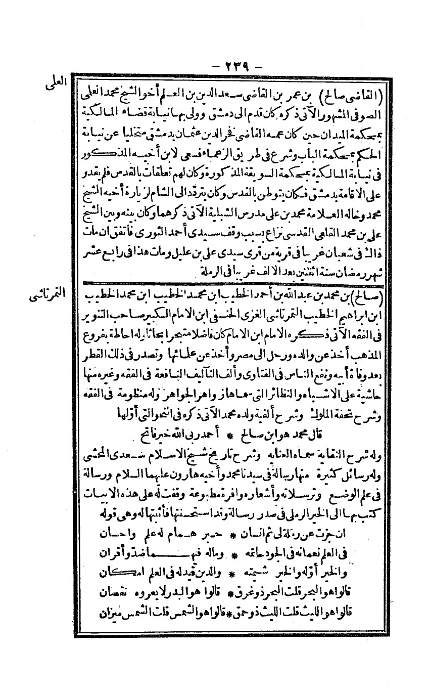 القَاضِي صَالح بن عمر بن القَاضِي سعد الدّين بن الْعلم أَخُو الشَّيْخ مُحَمَّد العلمي الصُّوفِي الْمَشْهُور الْآتِي ذكره كَانَ قدم إِلَى دمشق وَولي بهَا نِيَابَة قَضَاء الْمَالِكِيَّة بمحكمة الميدان حِين كَانَ عَمه القَاضِي فَخر الدّين عُثْمَان بِدِمَشْق متخلياً عَن نِيَابَة الحكم بمحكمة الْبَاب وَشرع فِي طَرِيق الزعماء فسعى لِابْنِ أَخِيه الْمَذْكُور فِي نِيَابَة الْمَالِكِيَّة بمحكمة السويقة الْمَذْكُورَة وَكَانَ لَهُم تعلقات بالقدس فَلم يقدر على الْإِقَامَة بِدِمَشْق فَكَانَ يتوطن بالقدس وَكَانَ يتَرَدَّد إِلَى الشَّام لزيارة أَخِيه الشَّيْخ مُحَمَّد وخاله الْعَلامَة مُحَمَّد بن عَليّ مدرس الشبلية الْآتِي ذكرهمَا وَكَانَ بَينه وَبَين الشَّيْخ عَليّ بن مُحَمَّد القلعي الْقُدسِي نزاع بِسَبَب وقف سَيِّدي أَحْمد الثَّوْريّ فاتفق أَن مَاتَ ذَاك فِي شعْبَان غَرِيبا فِي قَرْيَة من قرى سَيِّدي عَليّ بن عليل وَمَات هَذَا فِي رَابِع عشر شهر رَمَضَان سنة اثْنَتَيْنِ بعد الْألف غَرِيبا فِي الرملة