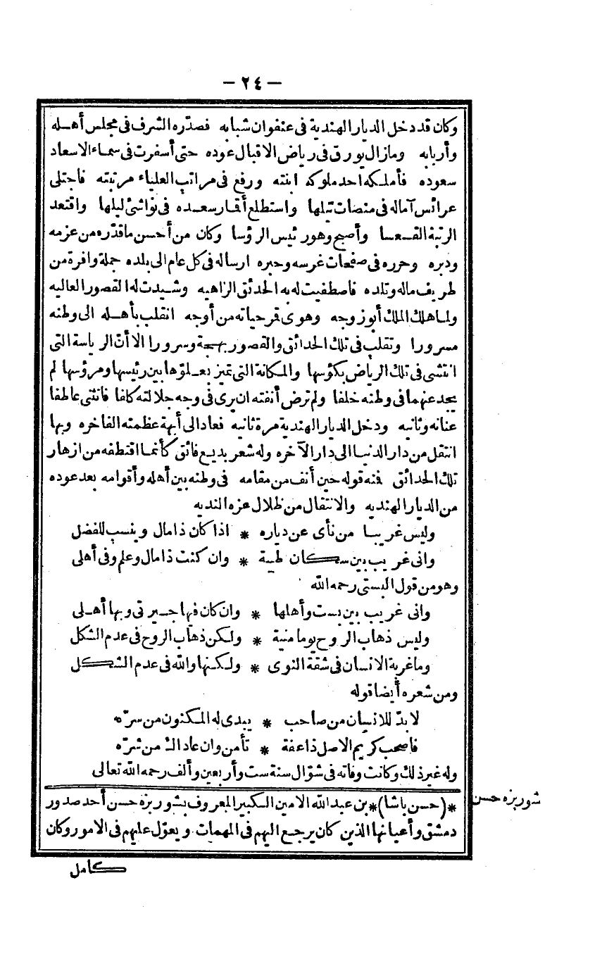وَكَانَ قد دخل الديار الْهِنْدِيَّة فِي عنفوان شبابه فصدره الشّرف فِي مجْلِس أَهله وأربابه وَمَا زَالَ يورق فِي رياض الإقبال عوده حَتَّى أسفرت فِي سَمَاء الأسعاد سعوده فأملكه أحد ملوكه ابْنَته وَرفع فِي مَرَاتِب العلياء مرتبته فاجتلى عرائس آماله فِي منصات تيلها واستطلع أقمار سعده فِي نواشي لَيْلهَا واقتعد الرُّتْبَة القعا وَأصْبح وَهُوَ رَئِيس الرؤسا وَكَانَ من أحسن مَا قدر من عزمه وَدبره وحرره فِي صفحات غرسه وحبره إرْسَاله فِي كل عَام إِلَى بَلْدَة جملَة وافرة من طريف مَاله وتلده فاصفيت لَهُ بِهِ الحدائق الزاهية وشيدت لَهُ الْقُصُور الْعَالِيَة وَلما هلك الْملك أَبُو زوجه وَهوى قرحياته من أوجه انْقَلب بأَهْله إِلَى وَطنه مَسْرُورا وتقلت فِي تِلْكَ الحدائق والقصور بهجة وسرورا أَلا أَن الرياسة الَّتِي انتشى فِي تِلْكَ الرياض بكؤسها والمكانة الَّتِي تميز بعلوها بَين رئيسها ومرؤسها لم يجد عَنْهُمَا فِي وَطنه خلفا وَلم ترض أنفته أَن يرى فِي وَجه جلالته كلفا فأنثنى عاطفا عنانه وثانيه وَدخل الديار الْهِنْدِيَّة مرّة ثَانِيَة فَعَاد إِلَى أبهة عَظمته الفاخرة وَبهَا انْتقل من دَار الدُّنْيَا إِلَى دَار الْآخِرَة وَله شعر بديع فائق كَأَنَّمَا اقتطفه من أزهار تِلْكَ الحدائق فَمِنْهُ قَوْله حِين أنف من مقَامه فِي وَطنه بَين أَهله وأقوامه بِعَدَد عوده من الديار الْهِنْدِيَّة والإنتقال من ظلال عزه الندية