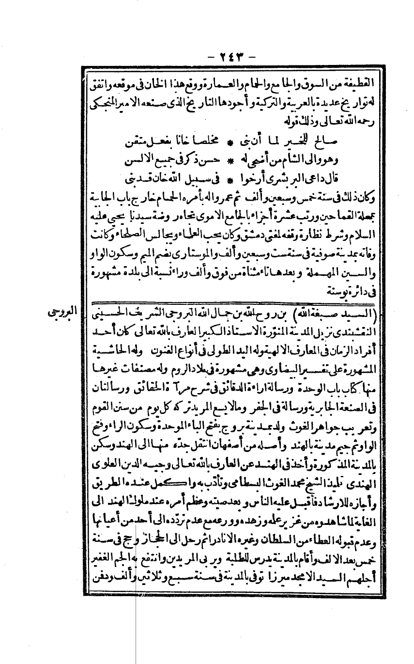 السَّيِّد صبغة الله بن روح الله بن جمال الله البروجي الشريف الْحُسَيْنِي النقشبندي نزيل الْمَدِينَة المنورة الْأُسْتَاذ الْكَبِير الْعَارِف بِاللَّه تَعَالَى كَانَ أحد أَفْرَاد الزَّمَان فِي المعارف الإلهية وَله الْيَد الطُّولى فِي أَنْوَاع الْفُنُون وَله الْحَاشِيَة الْمَشْهُورَة على تَفْسِير الْبَيْضَاوِيّ وَهِي مَشْهُورَة فِي بِلَاد الرّوم وَله مصنفات غَيرهَا مِنْهَا كتاب بَاب الْوحدَة ورسالة إراءة الدقائق فِي شرح مرْآة الْحَقَائِق ورسالتان فِي الصَّنْعَة الجابرية ورسالة فِي الجفر وَمَا لَا يسع المريد تَركه كل يَوْم من سنَن الْقَوْم وتعريب جَوَاهِر الْغَوْث ولد بِمَدِينَة بروج بِفَتْح الْبَاء الْمُوَحدَة وَسُكُون الرَّاء وَفتح الْوَاو ثمَّ جِيم مَدِينَة بِالْهِنْدِ وَأَصله من أصفهان انْتقل جده مِنْهَا إِلَى الْهِنْد وَسكن بِالْمَدِينَةِ الْمَذْكُورَة وَأخذ فِي الْهِنْد عَن الْعَارِف بِاللَّه تَعَالَى وجيه الدّين الْعلوِي الْهِنْدِيّ تلميذ الشَّيْخ مُحَمَّد الْغَوْث البسطامي وتأدب بِهِ وأكمل عِنْده الطَّرِيق وَأَجَازَهُ للإرشاد فَأقبل عَلَيْهِ النَّاس وَبعد صيته وَعظم أمره عِنْد مُلُوك الْهِنْد إِلَى الْغَايَة لما شاهدوه من غزير علمه وزهده وورعه مَعَ عدم تردده إِلَى أحد من أعيانها وَعدم قبُوله الْعَطاء من السُّلْطَان وَغَيره إِلَّا نَادرا ثمَّ رَحل إِلَى الْحجاز وَحج فِي سنة خمس بعد الْألف وَأقَام بِالْمَدِينَةِ يدرس للطلبة ويربي المريدين وانتفع بِهِ الجم الْغَفِير أَجلهم السَّيِّد الأمجد ميرزا توفّي بِالْمَدِينَةِ فِي سنة سبع وَثَلَاثِينَ وَألف وَدفن