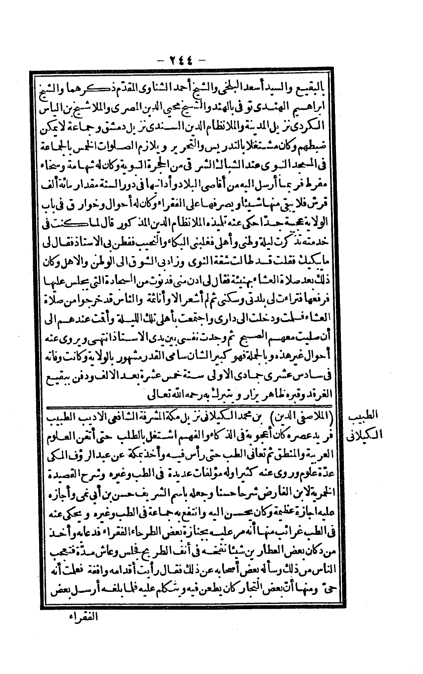 الملاصفي الدّين بن مُحَمَّد الكيلاني نزيل مَكَّة المشرفة الشَّافِعِي الأديب الطَّبِيب فريد عصره كَانَ أعجوبة فِي الذكاء والفهم اشْتغل بِالطَّلَبِ حَتَّى أتقن الْعُلُوم الْعَرَبيَّة والمنطق ثمَّ تعانى الطِّبّ حَتَّى رَأس فِيهِ وَأخذ بِمَكَّة عَن عبد الرؤوف الْمَكِّيّ عدَّة عُلُوم وروى عَنهُ كثيرا وَله مؤلفات عديدة فِي الطِّبّ وَغَيره وَشرح القصيدة الخمرية لِابْنِ الفارض شرحاً حسنا وَجعله باسم الشريف حسن بن أبي نمي وَأَجَازَهُ عَلَيْهِ إجَازَة عَظِيمَة وَكَانَ يحسن إِلَيْهِ وانتفع بِهِ جمَاعَة فِي الطِّبّ وَغَيره ويحكى عَنهُ فِي الطِّبّ غرائب مِنْهَا أَنه مر عَلَيْهِ بِجنَازَة بعض الطرحاء الْفُقَرَاء فَدَعَا بِهِ وَأخذ من دكان بعض العطارين شَيْئا نفخه فِي أنف الطريح فَجَلَسَ وعاش مُدَّة فتعجب النَّاس من ذَلِك وَسَأَلَهُ بعض أَصْحَابه عَن ذَلِك فَقَالَ رَأَيْت أقدامه واقفة فَعلمت أَنه حَيّ وَمِنْهَا أَن بعض التُّجَّار كَانَ يطعن فِيهِ وَيتَكَلَّم عَلَيْهِ فَلَمَّا بلغه أرسل بعض