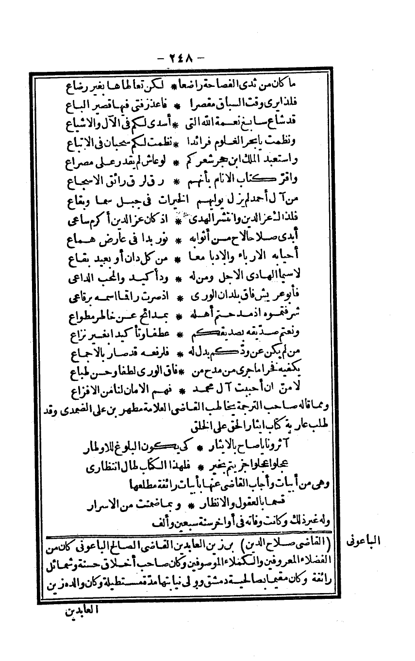 القَاضِي صَلَاح الدّين بن زين العابدين القَاضِي الصَّالح الباعوني كَانَ من الْفُضَلَاء المعروفين والكملاء الموصوفين وَكَانَ صَاحب أَخْلَاق حَسَنَة وشمائل رائقة وَكَانَ مُقيما بصالحية دمشق وَولي نيابتها مدّة مستطيلة وَكَانَ وَالِده زين
