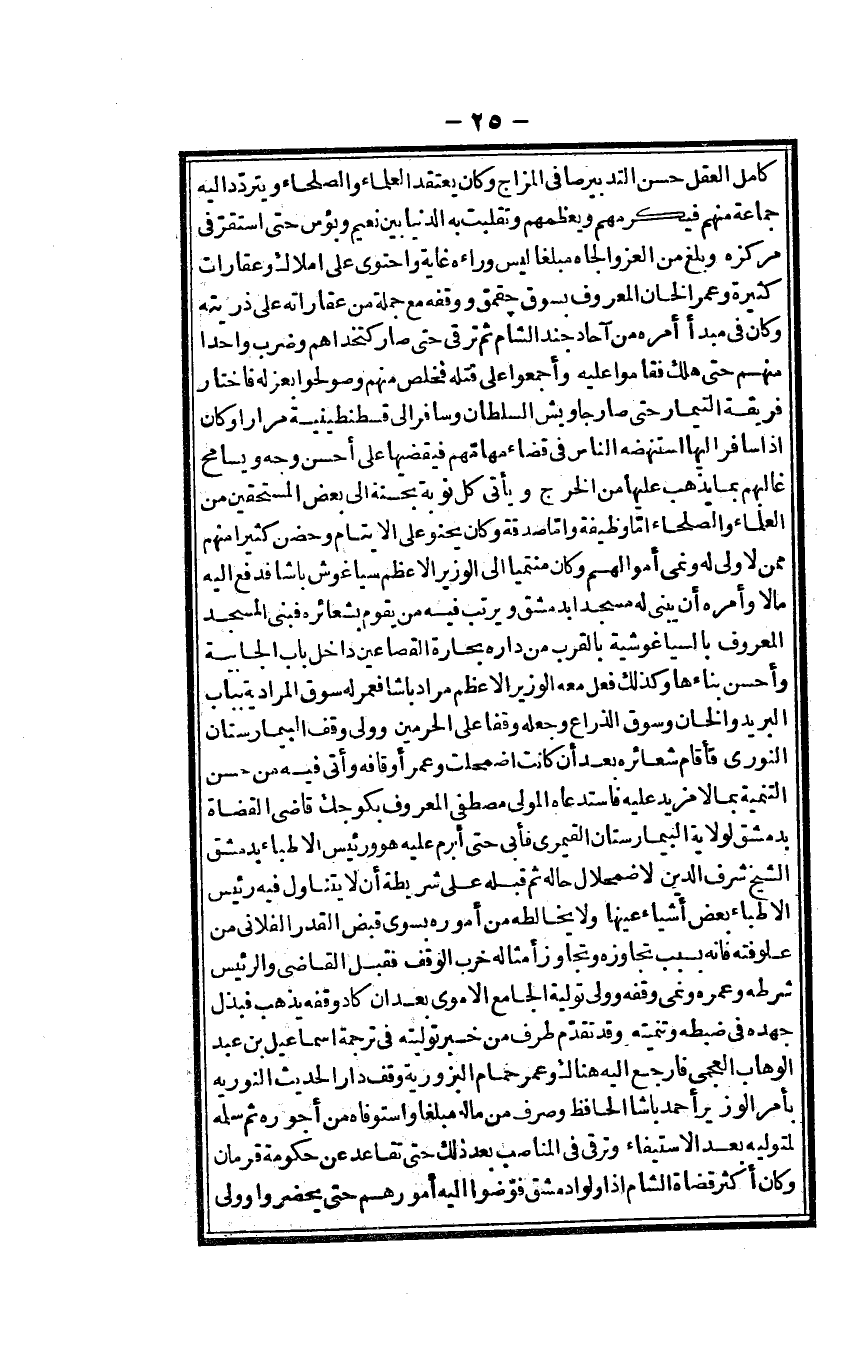 كَامِل الْعقل حسن التَّدْبِير صافي المزاح وَكَانَ يعْتَمد الْعلمَاء والصلحاء ويتردد إِلَيْهِ جمَاعَة مِنْهُم فيكرمهم ويعظمهم وتقلبت بهَا الدُّنْيَا بَين نعيم وبؤس حَتَّى اسْتَقر فِي مركزه وَبلغ من الْعِزّ والجاه مبلغا لَيْسَ وَرَاءه غَايَة واحتوى على أَمْلَاك وعقارات كَثِيرَة وَعمر الخان الْمَعْرُوف بسوق جقمق وَوَقفه مَعَ جملَة من عقاراته على ذُريَّته وَكَانَ فِي مبدأ أمره من آحَاد جند الشَّام ثمَّ ترقى حَتَّى صَار كتخد أهم وَضرب وَاحِدًا مِنْهُم حَتَّى هلك فَقَامُوا عَلَيْهِ وَأَجْمعُوا على قَتله فخلص مِنْهُم وصولحوا بعزله فَاخْتَارَ فريقة التيمار حَتَّى صَار جاويش السُّلْطَان وسافر إِلَى قسطنطينية مرَارًا وَكَانَ إِذا سَافر إِلَيْهَا استنهضه النَّاس فِي قَضَاء مهامهم فيقضيها على أحسن وَجه ويسامح غالبهم بِمَا يذهب عَلَيْهَا من الخرج وَيَأْتِي كل نوبَة بحسنة إِلَى بعض الْمُسْتَحقّين من الْعلمَاء والصلحاء إِمَّا وَظِيفَة وَإِمَّا صَدَقَة وَكَانَ يحنو على الْأَيْتَام وحضن كثيرا مِنْهُم مِمَّن لَا ولي لَهُ ونمى أَمْوَالهم وَكَانَ منتميا إِلَى الْوَزير الْأَعْظَم سياغوش باشا فَدفع إِلَيْهِ مَالا وَأمره أَن يَبْنِي لَهُ مَسْجِدا بِدِمَشْق ويرتب فِيهِ من يقوم بشعائره فَبنى الْمَسْجِد الْمَعْرُوف بالسياغوشية بِالْقربِ من دَاره بحارة القصاعين دَاخل بَاب الْجَابِيَة وَأحسن بناءها وَكَذَلِكَ فعل مَعَه الْوَزير الْأَعْظَم مُرَاد باشا فعمر لَهُ سوق المرادية بِبَاب الْبَرِيد والخان وسوق الذِّرَاع وَجعله وَقفا على الْحَرَمَيْنِ وَولى وقف البيمارستان النوري فَأَقَامَ شعائره بعد أَن كَانَت اضمحلت وَعمر أوقافه وأتى فِيهِ من حسن التنمية بِمَا لَا مزِيد عَلَيْهِ فاستدعاه الْمولى مصطفى الْمَعْرُوف بكوجك قَاضِي الْقُضَاة بِدِمَشْق لولاية البيمارستان القيمرى فَأبى حَتَّى أبرم عَلَيْهِ هُوَ وَرَئِيس الْأَطِبَّاء بِدِمَشْق الشَّيْخ شرف الدّين لاضمحلال حَاله ثمَّ قبله على شريطة أَن لَا يتَنَاوَل فِيهِ رَئِيس الْأَطِبَّاء بعض أَشْيَاء عينهَا وَلَا يخالطه من أُمُوره بسوي قبض الْقدر الْفُلَانِيّ من علوفته فَأَنَّهُ بِسَبَب تجاوزه وَتجَاوز أَمْثَاله خرب الْوَقْف فَقبل القَاضِي والرئيس شَرطه وعمره ونمى وَقفه وَولى تَوْلِيَة الْجَامِع الْأمَوِي بعد أَن كَانَ وَقفه يذهب فبذل جهده فِي ضَبطه وتنميته وَقد تقدم طرف من خبر تَوليته فِي تَرْجَمَة إِسْمَاعِيل بن عبد الْوَهَّاب العجمي فَارْجِع إِلَيْهِ هُنَاكَ وَعمر حمام البزورية وقف دَار الحَدِيث النورية بِأَمْر الْوَزير أَحْمد باشا الْحَافِظ وَصرف من مَاله مبلغا واستوفاه من أجوره ثمَّ سلمه لمتوليه بعد الِاسْتِيفَاء وترقى فِي المناصب بعد ذَلِك حَتَّى تقاعد عَن حُكُومَة قرمان وَكَانَ أَكثر قُضَاة الشَّام إِذا ولوا دمشق فَوضُوا إِلَيْهِ أُمُورهم حَتَّى يحضروا وَولي