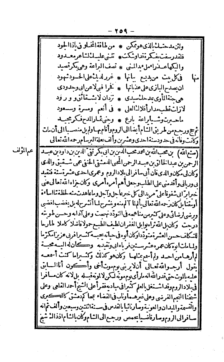 صنع الله بن محب الله بن مُحَمَّد محب الدّين بن أبي بكر تَقِيّ الدّين بن دَاوُد بن عبد الرَّحْمَن بن عبد الْخَالِق بن عبد الرَّحْمَن المحبي الدِّمَشْقِي الْحَنَفِيّ عمي شَقِيق وَالِدي وَكَانَ لي مَكَان وَالِدي فَإِن أبي سَافر إِلَى بِلَاد الرّوم وعمري إِحْدَى عشرَة سنة فتقيد بِي ورباني وأقدمني على الطّلب وَجعل أهم أمره أَمْرِي وَكَانَ جزاه الله تَعَالَى عني خيرا برا بِي شفوقاً عَليّ مرِيدا لي كل خير عَاجل وآجل وَمَا عَاهَدت مِنْهُ لَحْظَة مَا إساءة أَو مقتاً بل كَانَ رَحمَه الله تَعَالَى يألم لما آلم مِنْهُ وينشرح لما أنشرح لَهُ بل يغْضب لغضبي ويرضى لرضائي وعَلى كثير من مناهجه فِي التودد نهجت وعَلى آدابه وَحسن طويته درجت وَكَانَ بل الله ثراه بوابل الغفران لطيف الطَّبْع حمولاً فَاضلا كَامِلا طارحاً للتكلف حسن الْعشْرَة متودداً وَكَانَ أَبوهُ فيحياته يُحِبهُ كثيرا فربى عَزِيزًا مكرماً وَلما مَاتَ أَبوهُ كَانَ عمره عشر سِنِين فرباه أبي وتقيد بِهِ وَكَانَ لَهُ إِلَيْهِ محبَّة لم أرها من أحد وَلم أسمع بِمِثْلِهَا وَكَانَ هُوَ كَذَلِك وَكَثِيرًا مَا كنت أسمعهُ يَقُول أَرْجُو الله تَعَالَى أَن لَا يريني يَوْم موت أخي وأكون أَنا السَّابِق عَلَيْهِ بِالْمَوْتِ حَتَّى قدر الله أَنه مَا رأى يَوْم مَوته لَكِن لَا لمَوْته قبله بل لِأَنَّهُ كَانَ مُسَافِرًا فِي بِلَاد الرّوم وَقد اشْتغل بِالْعلمِ كثيرا فِي مباديه فَقَرَأَ على الشَّيْخ أَحْمد القلعي وعَلى شَيخنَا النَّجْم الفرضي وعَلى غَيرهمَا وناب فِي الْقَضَاء بمحاكم دمشق كالكبرى وَالْقِسْمَة والميدان والعونية وَصَارَ نَائِبا بالقدس فِي سنة اثْنَتَيْنِ وَسبعين وَألف ثمَّ إِنَّه سَافر إِلَى الرّوم وَصَارَ قَاضِيا بحمص وَرجع إِلَى الشَّام وَكَانَ بِالشَّام إِذْ ذَاك شيخ