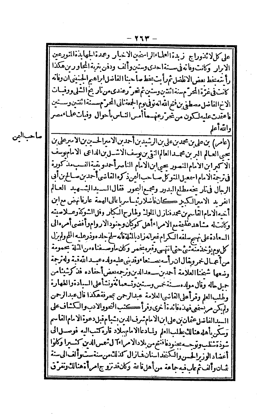 عَامر بن عَليّ بن مُحَمَّد بن عَليّ بن الرشيد بن أَحْمد بن الْأَمِير الْحُسَيْن بن الْأَمِير عَليّ بن يحيى الْعَالم الْبر بن مُحَمَّد الْعَالم التقي بن يُوسُف الأشل بن الدَّاعِي الإِمَام يُوسُف الْأَكْبَر ابْن الإِمَام الْمَنْصُور يحيى ابْن الإِمَام النَّاصِر أَحْمد وَبَقِيَّة النّسَب مَذْكُورَة فِي تَرْجَمَة الإِمَام إِسْمَاعِيل المتَوَكل صَاحب الْيمن ذكره القَاضِي أَحْمد بن صَالح بن أبي الرِّجَال فِي تَارِيخه مطلع البدور وَمجمع البحور فَقَالَ السَّيِّد الشَّهِيد الْعَالم الفريد الْأَمِير الْكَبِير كَانَ فَاضلا رَئِيسا سرياً عالي الهمة عَارِفًا نَهَضَ مَعَ ابْن أَخِيه الإِمَام الْقَاسِم بن مُحَمَّد فنازل الْمُلُوك وطارح الْكِبَار وفل الشَّوْكَة وَعلا صيته وَكَانَت لَهُ مشَاهد عَظِيمَة مَعَ الْأُمَرَاء أهل كوكبان وجنود الأروام وأفضى أمره إِلَى السَّعَادَة على نهج سلفه الْكِرَام غير أَنه زَاد بالمثلة فَإِنَّهُ سلخ جلده وذر عَلَيْهِ الْملح وَلم يزل كل يَوْم يُؤْخَذ مِنْهُ شَيْء حَتَّى انْتهى وقبره بِخَمْر وَكَانَ مَا وصفناه من الْمثلَة بحمومة من أَعمال خمر وَيُقَال إِن رَأسه بِصَنْعَاء وَقد بنى عَلَيْهِ وَلَده عبد الله قبَّة وَله تَرْجَمَة وَضعهَا شَيخنَا الْعَلامَة أَحْمد بن سعد الدّين وترجمه بعض أحفاده فَذكر شَيْئا من جميل حَاله وَقَالَ مولده سنة خمس وَسِتِّينَ وَتِسْعمِائَة وَنَشَأ على السِّيَادَة وَالطَّهَارَة وَطلب الْعلم وَقَرَأَ على القَاضِي الْعَلامَة عبد الرَّحْمَن بمحرفة هَكَذَا قَالَ عبد الرَّحْمَن وَلم يكن مر بسمعي فَائِدَة فَائِدَة أُخْرَى وَقَرَأَ كتب النَّحْو وَالْأَدب والكشاف على السَّيِّد الْفَاضِل عُثْمَان بن عَليّ ابْن الإِمَام شرف الدّين بشبام قبل دَعْوَة الإِمَام الْقَاسِم وَسكن بأَهْله هُنَاكَ يطْلب الْعلم وَلما دَعَا الإِمَام بِبِلَاد قاره كتب إِلَيْهِ فوصل إِلَى شوذة شظب وَتوجه بجُنُوده فَافْتتحَ من بلَاء الْأُمَرَاء آل شمس الدّين كثيرا وَكَانُوا أعضاد الْوَزير الْحسن والكتخدا سِنَان فَمَا زَالَ كَذَلِك من سنة سِتّ وَألف إِلَى سنة ثَمَان وَألف ثمَّ عَابَ فِيهِ جمَاعَة من أهل قاعة وَكَانَ قد تزوج امْرَأَة هُنَالك وتفرّق