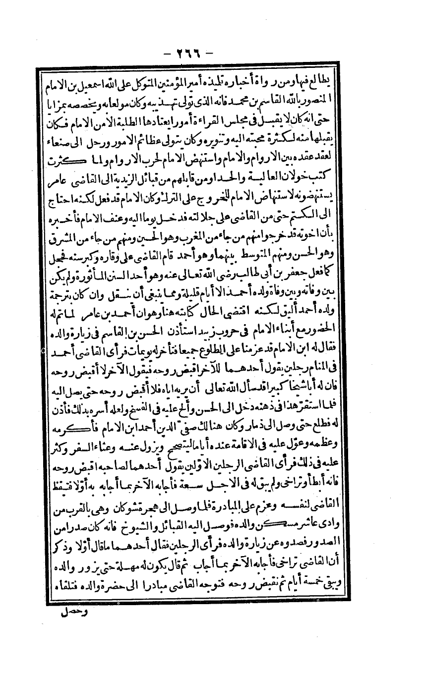 يطالع فِيهَا وَمن رُوَاة أخباره تِلْمِيذه أَمِير الْمُؤمنِينَ المتَوَكل على الله إِسْمَاعِيل بن الإِمَام الْمَنْصُور بِاللَّه الْقَاسِم بن مُحَمَّد فَإِنَّهُ الَّذِي تولى تهذيبه وَكَانَ مُولَعا بِهِ ويخصصه بمزايا حَتَّى إِنَّه كَانَ لَا يقبل فِي مجْلِس الْقِرَاءَة أُمُور يعتادها الطّلبَة إِلَّا من الامام فَكَانَ يقبلهَا مِنْهُ لِكَثْرَة محبته إِلَيْهِ وتنويره وَكَانَ يتَوَلَّى عظائم الْأُمُور ورحل إِلَى صنعاء لعقد عقده بَين الأروام وَالْإِمَام واستنهض الإِمَام لِحَرْب الأروام وَلما كثرت كتب خولان الْعَالِيَة والحدا وَمن قابلهم من قبائل الزيدية إِلَى القَاضِي عَامر يستنهضونه لاستنهاض الإِمَام لِلْخُرُوجِ على التّرْك وَكَانَ الإِمَام قد فعل لكنه احْتَاجَ إِلَى الكتم حَتَّى من القَاضِي على جلالته فَدخل يَوْمًا إِلَيْهِ وعنف الإِمَام فَأخْبرهُ بِأَن أخوته قد خَرجُوا مِنْهُم من جَاءَ من الْمغرب وَهُوَ الْحُسَيْن وَمِنْهُم من جَاءَ من الْمشرق وَهُوَ الْحسن وَمِنْهُم الْمُتَوَسّط بَينهمَا وَهُوَ أَحْمد قَامَ القَاضِي على وقاره وَكبر سنه فحجل كَمَا فعل جَعْفَر بن أبي طَالب رَضِي الله عَنهُ وَهُوَ أحد السّنَن المأثورة وَلم يكن بَين وَفَاته وَبَين وَفَاة وَلَده أَحْمد إِلَّا أَيَّام قَليلَة وَمِمَّا يَنْبَغِي أَن ينْقل وَإِن كَانَ بترجمة وَلَده أَحْمد أليق لكنه اقْتضى الْحَال كِتَابَته هُنَا وَهُوَ أَن أَحْمد بن عَامر لما تمّ لَهُ الْحُضُور مَعَ أَبنَاء الإِمَام فِي حروب زبيد اسْتَأْذن الْحسن بن الْقَاسِم فِي زِيَارَة وَالِده فَقَالَ لَهُ ابْن الإِمَام قد عزمنا على الطُّلُوع جَمِيعًا فَتَأَخر لَهُ يويمات فَرَأى القَاضِي أَحْمد فِي الْمَنَام رجلَيْنِ يَقُول أَحدهمَا للْآخر اقبض روحه فَيَقُول الآخر لَا أَقبض روحه فَإِن لَهُ أَبَا شَيخا كَبِيرا قد سَأَلَ الله تَعَالَى أَن يرِيه إِيَّاه فَلَا أَقبض روحه حَتَّى يصل إِلَيْهِ فَلَمَّا اسْتَقر هَذَا فِي ذهنه دخل إِلَى الْحسن وألح عَلَيْهِ فِي الْفَسْخ وَلَعَلَّه أسره بذلك فَأذن لَهُ فطلع حَتَّى وصل إِلَى ذمار وَكَانَ هُنَالك صفي الدّين أَحْمد ابْن الإِمَام فَأكْرمه وعظمه وعول عَلَيْهِ فِي الْإِقَامَة عِنْده أَيَّامًا ليتصحح وَيَزُول عَنهُ وعثاء السّفر وَكثر عَلَيْهِ فِي ذَلِك فَرَأى القَاضِي الرجلَيْن الْأَوَّلين يَقُول أَحدهمَا لصَاحبه اقبض روحه فَإِنَّهُ أَبْطَأَ وتراخى وَلم يبْق لَهُ فِي الْأَجَل سَعَة فَأَجَابَهُ الآخر بِمَا أَجَابَهُ بِهِ أَولا فتيقظ القَاضِي لنَفسِهِ وعزم على الْمُبَادرَة فَلَمَّا وصل إِلَى هِجْرَة مشوكان وَهِي بِالْقربِ من وَادي عَاشر مسكن وَالِده فوصل إِلَيْهِ الْقَبَائِل والشيوخ فَإِنَّهُ كَانَ صدر آمن الصُّدُور فصدوه عَن زِيَارَة وَالِده فَرَأى الرجلَيْن فَقَالَ أَحدهمَا مَا قَالَ أَولا وَذكر أَن القَاضِي ترَاخى فَأَجَابَهُ الآخر أجَاب ثمَّ قَالَ يكون لَهُ مهلة حَتَّى يزور وَالِده وَيبقى خَمْسَة أَيَّام ثمَّ نقبض روحه فَتوجه القَاضِي مبادراً إِلَى حَضْرَة وَالِده فَتَلقاهُ