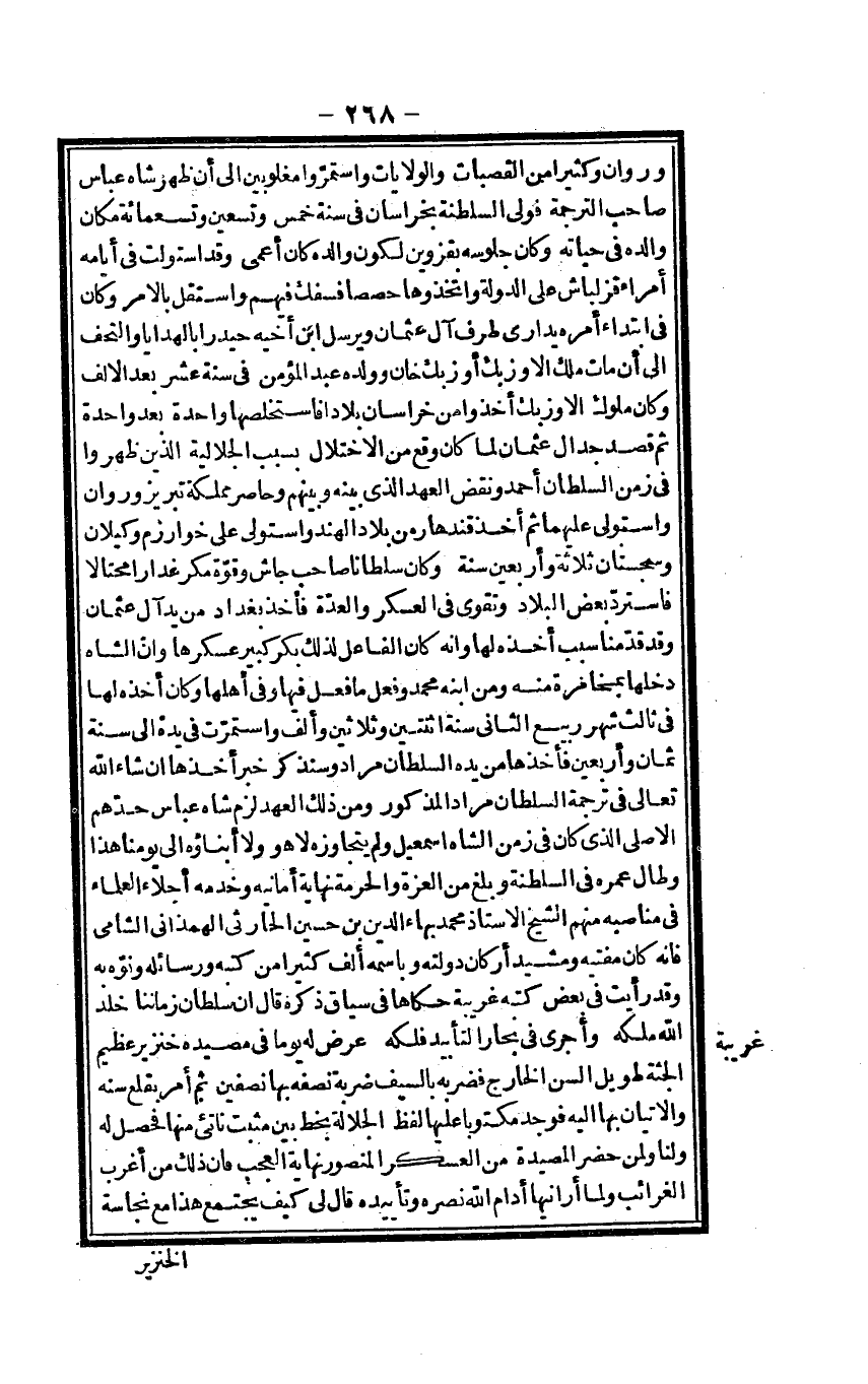 وروان وَكَثِيرًا من القصبات والولايات واستمروا مغلوبين إِلَى أَن ظهر شاه عَبَّاس صَاحب التَّرْجَمَة فولى السلطنة بخراسان فِي سنة خمس وَتِسْعين وَتِسْعمِائَة مَكَان وَالِده فِي حَيَاته وَكَانَ جُلُوسه بقزوين لكَون وَالِده كَانَ أعمى وَقد استولت فِي أَيَّامه أُمَرَاء قزلباش على الدولة واتخذوها حصصاً فسفك فيهم واستقل بِالْأَمر وَكَانَ فِي ابْتِدَاء أمره يدارى طرف آل عُثْمَان وَيُرْسل ابْن أَخِيه حيدر بالهدايا والتحف إِلَى أَن مَاتَ ملك الأوزبك أوزبك خَان وَولده عبد الْمُؤمن فِي سنة عشر بعد الْألف وَكَانَ مُلُوك الأوزبك أخذُوا من خُرَاسَان بلاداً فاستخلصها وَاحِدَة بعد وَاحِدَة ثمَّ قصد جِدَال عُثْمَان لما كَانَ وَقع من الاختلال بِسَبَب الجلالية الَّذين ظَهَرُوا فِي زمن السُّلْطَان أَحْمد وَنقض الْعَهْد الَّذِي بَينه وَبينهمْ وحاصر مملكة تبريز وروان وَاسْتولى عَلَيْهِمَا ثمَّ أَخذ قندهار من بِلَاد الْهِنْد وَاسْتولى على خوارزم وكيلان وسجستان ثَلَاثَة وَأَرْبَعين سنة وَكَانَ سُلْطَانا صَاحب جاش وَقُوَّة مكر غداراً محتالاً فاسترد بعض الْبِلَاد وتقوى فِي الْعَسْكَر وَالْعدة فَأخذ بَغْدَاد من يَد آل عُثْمَان وَقد قدمنَا سَبَب أَخذه لَهَا وَإنَّهُ كَانَ الْفَاعِل لذَلِك بكر كَبِير عسكرها وَإِن الشاه دَخلهَا بمخامرة مِنْهُ وَمن ابْنه مُحَمَّد وَفعل مَا فعل فِيهَا وَفِي أَهلهَا وَكَانَ أَخذه لَهَا فِي ثَالِث شهر ربيع الثَّانِي سنة اثْنَتَيْنِ وَثَلَاثِينَ وَألف واستمرت فِي يَده إِلَى سنة ثَمَان وَأَرْبَعين فَأَخذهَا من يَده السُّلْطَان مُرَاد وَسَنذكر خبر أَخذهَا إِن شَاءَ الله تَعَالَى فِي تَرْجَمَة السُّلْطَان مُرَاد الْمَذْكُور وَمن ذَلِك الْعَهْد لزم شاه عَبَّاس حَدهمْ الْأَصْلِيّ الَّذِي كَانَ فِي زمن الشاه اسماعيل وَلم يتجاوزه لَا هُوَ وَلَا أبناؤه إِلَى يَوْمنَا هَذَا وَطَالَ عمره فِي السلطنة وَبلغ من الْعِزَّة وَالْحُرْمَة نِهَايَة أمانيه وخدمه أجلاء الْعلمَاء فِي مناصبه مِنْهُم الشَّيْخ الاستاذ مُحَمَّد بهاء الدّين بن حُسَيْن الْحَارِثِيّ الْهَمدَانِي الشَّامي فَإِنَّهُ كَانَ مفتيه ومشيد أَرْكَان دولته وباسمه ألف كثيرا من كتبه ورسائله ونوه بِهِ وَقد رَأَيْت فِي بعض كتبه غَرِيبَة حَكَاهَا فِي سِيَاق ذكره قَالَ إِن سُلْطَان زَمَاننَا خلد الله ملكه وأجرى فِي بحار التَّأْبِيد فلكه عرض لَهُ يَوْمًا فِي مصيده خِنْزِير عَظِيم الجثة طَوِيل السن الْخَارِج فَضَربهُ بِالسَّيْفِ ضربه نصفه بهَا نِصْفَيْنِ ثمَّ أَمر بقلع سنه والاتيان بهَا إِلَيْهِ فَوجدَ مَكْتُوبًا عَلَيْهَا لفظ الْجَلالَة بِخَط بَين مُثبت ناتىء مِنْهَا فَحصل لَهُ وَلنَا وَلمن حضر المصيدة من الْعَسْكَر الْمَنْصُور نِهَايَة الْعجب فَإِن ذَلِك من أغرب الغرائب وَلما أرانيها أدام الله نَصره وتأييده قَالَ لي كَيفَ يجْتَمع هَذَا مَعَ نَجَاسَة