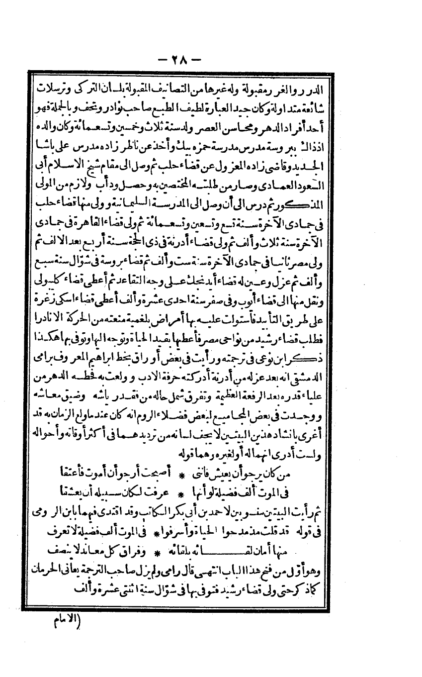 الدُّرَر وَالْغرر مَقْبُولَة وَله غَيرهَا من التصانيف المقبولة بِلِسَان التركي وترسلات شائعة متداولة وَكَانَ جيد الْعبارَة لطيف الطَّبْع صَاحب نَوَادِر وتحف وَبِالْجُمْلَةِ فَهُوَ أحد أَفْرَاد الدَّهْر ومحاسن الْعَصْر ولد سنة ثَلَاث وَخمسين وَتِسْعمِائَة وَكَانَ وَالِده إِذْ ذَاك ببروسة مدرس مدرسة حَمْزَة بيك وَأخذ عَن نَاظر زَاده مدرس عَليّ باشا الْجَدِيد وقاضي زَاده الْمَعْزُول عَن قَضَاء حلب ثمَّ وصل إِلَى مقَام شيخ الْإِسْلَام أبي السُّعُود الْعِمَادِيّ وَصَارَ من طلبته المختصين بِهِ وَحصل ودأب ولازم من الْمولى الْمَذْكُور ثمَّ درس إِلَى أَن وصل إِلَى الْمدرسَة السليمانية وَولى مِنْهَا قَضَاء حلب فِي جُمَادَى الْآخِرَة سنة تسع وَتِسْعين وَتِسْعمِائَة ثمَّ ولى قَضَاء الْقَاهِرَة فِي جُمَادَى الْآخِرَة سنة ثَلَاث وَألف ثمَّ ولى قَضَاء أدرنة فِي ذِي الْحجَّة سنة أَربع بعد الْألف ثمَّ ولى مصر ثَانِيًا فِي جُمَادَى الْآخِرَة سنة سِتّ وَألف ثمَّ قَضَاء بروسة فِي شَوَّال سنة سبع وَألف ثمَّ عزل وَعين لَهُ قَضَاء أيدنجك على وَجه التقاعد ثمَّ أعْطى قَضَاء كليبولي وَنقل مِنْهَا إِلَى قَضَاء أَيُّوب وَفِي صفر سنة إِحْدَى عشرَة وَألف أعْطى قَضَاء اسكى زغرة على طَرِيق التَّأْبِيد فاستولت عَلَيْهِ بهَا أمراض بلغمية منعته من الْحَرَكَة الأنادرا فَطلب قَضَاء رشيد من نواحي مصر فأعطيها بِقَيْد الْحَيَاة وَتوجه إِلَيْهَا وَتُوفِّي بهَا هَكَذَا ذكر ابْن نوعى فِي تَرْجَمته وَرَأَيْت فِي بعض أوراق بِخَط إِبْرَاهِيم الْمَعْرُوف برامي الدِّمَشْقِي أَنه بعد عَزله من أدرنة أَدْرَكته حِرْفَة الْأَدَب وولعت بِهِ فحطه الدَّهْر من علياء قدره بعد الرّفْعَة الْعَظِيمَة وتفرق شَمل حَاله من فقد رياشه وضيق معاشه وَوجدت فِي بعض المجاميع لبَعض فضلاء الرّوم أَنه كَانَ عِنْدَمَا ولع الزَّمَان بِهِ قد أغرى بإنشاد هذَيْن الْبَيْتَيْنِ لَا يجِف لِسَانه من ترديدهما فِي أَكثر أوقاته وأحواله وَلست أَدْرِي انهما لَهُ أَو لغيره وهما قَوْله