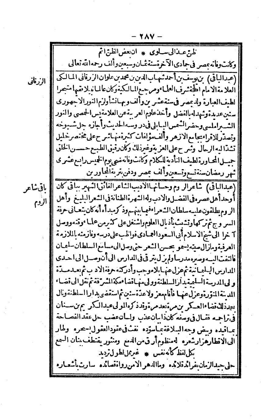 عبد الْبَاقِي شَاعِر الرّوم وحسانها الأديب الشَّاعِر الْفَائِق الشهير بباقي كَانَ أوحد أهل عصره فِي الْفضل وَالْأَدب وَله الشُّهْرَة الطنانة فِي الشّعْر البليغ وَأهل الرّوم يطلقون عَلَيْهِ سُلْطَان الشُّعَرَاء فِيمَا بَينهم وَذكر مبدأه أَنه كَانَ يتعانى حِرْفَة السُّرُوج ثمَّ تَركهَا وتشبث بأذيال الْعُلُوم واشتغل على كثير من عُلَمَاء وقته وَوصل آخرا إِلَى شيخ الْإِسْلَام أبي السُّعُود الْعِمَادِيّ فواظب على درسه وفاز مِنْهُ بالملازمة الْعُرْفِيَّة وَمَا زَالَ صيته يسمو بِحسن الشّعْر حَتَّى وصل إِلَى مسامع السُّلْطَان سُلَيْمَان فَالْتَفت إِلَيْهِ وصيره مدرساً وَلم يزل يترقى فِي الْمدَارِس إِلَى أَن وصل إِلَى إِحْدَى الْمدَارِس السليمانية ثمَّ عزل عَنْهَا بِلَا مُوجب وأدركته حِرْفَة الْأَدَب ثمَّ بعد مُدَّة ولي الْمدرسَة السليمية بدار السلطنة وَولي مِنْهَا قَضَاء مَكَّة المشرفة ثمَّ نقل إِلَى قَضَاء الْمَدِينَة المنورة وعزل عَنْهَا فَأَقَامَ معزولاً عدَّة سِنِين ثمَّ استقضى بدار السلطنة ونال بعد ذَلِك قَضَاء العسكرين مرّة بعد مرّة وَقد ذكره الْمولى عبد الْكَرِيم بن سِنَان فِي تراجمه فَقَالَ فِي وَصفه كَانَ ذَا بَيَان عذب ولسان عضب حل عقد الفصاحة بِمَا قَيده وبيض وَجه البلاغة بِمَا سوده نفث فِي عقول الْبَحْر بسحره وطار إِلَى الأقطار هزار شعره لَهُ منظوم أرق من الدمع ومنثور يقتطف ببنان السّمع