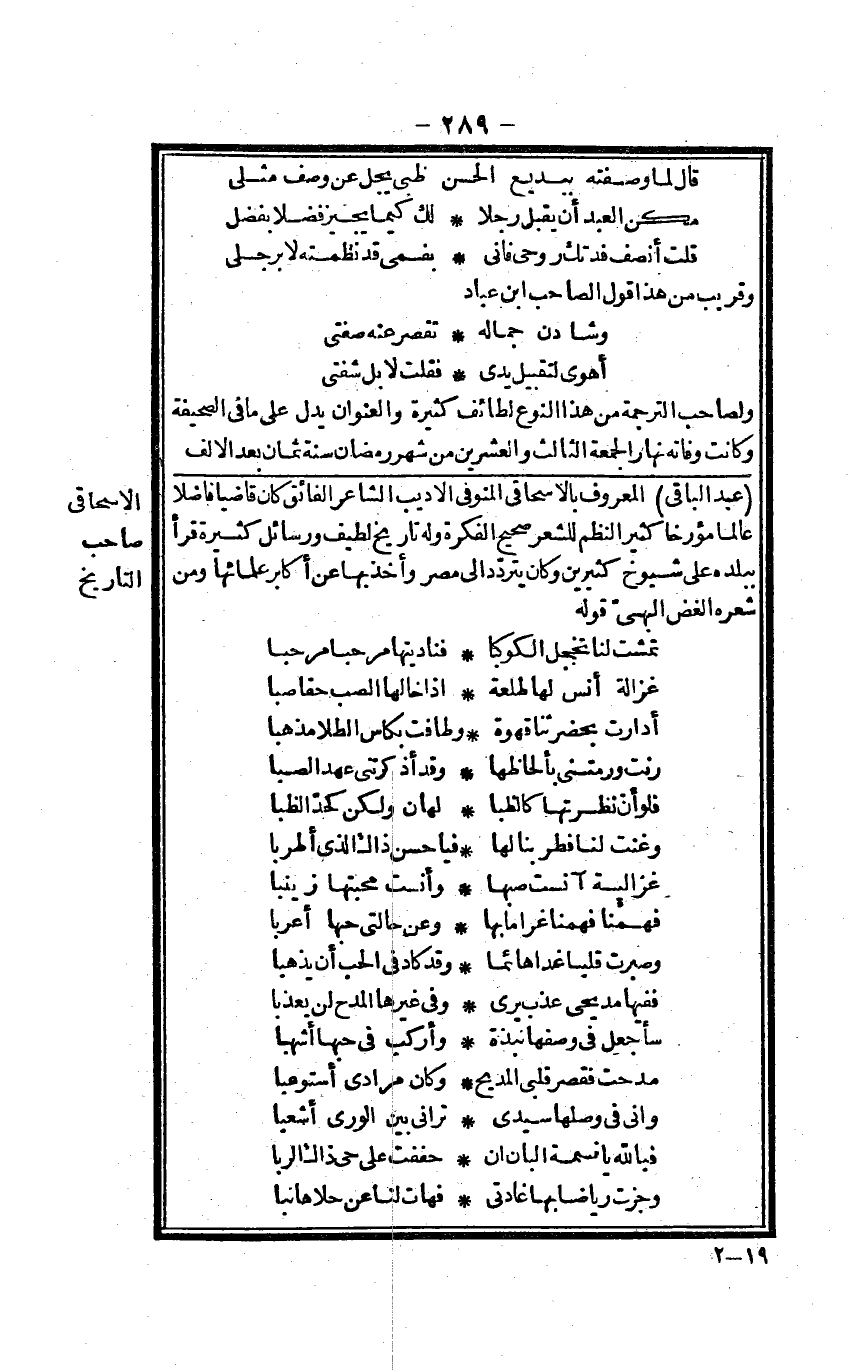 عبد الْبَاقِي الْمَعْرُوف بالإسحاقي المنوفي الأديب الشَّاعِر الْفَائِق كَانَ قَاضِيا فَاضلا عَالما مؤرخاً كثير النّظم للشعر صَحِيح الفكرة وَله تَارِيخ لطيف ورسائل كَثِيرَة قَرَأَ بِبَلَدِهِ على شُيُوخ كثيرين وَكَانَ يتردّد إِلَى مصر وَأخذ بهَا عَن أكَابِر علمائها وَمن شعره الغض الْبَهِي قَوْله