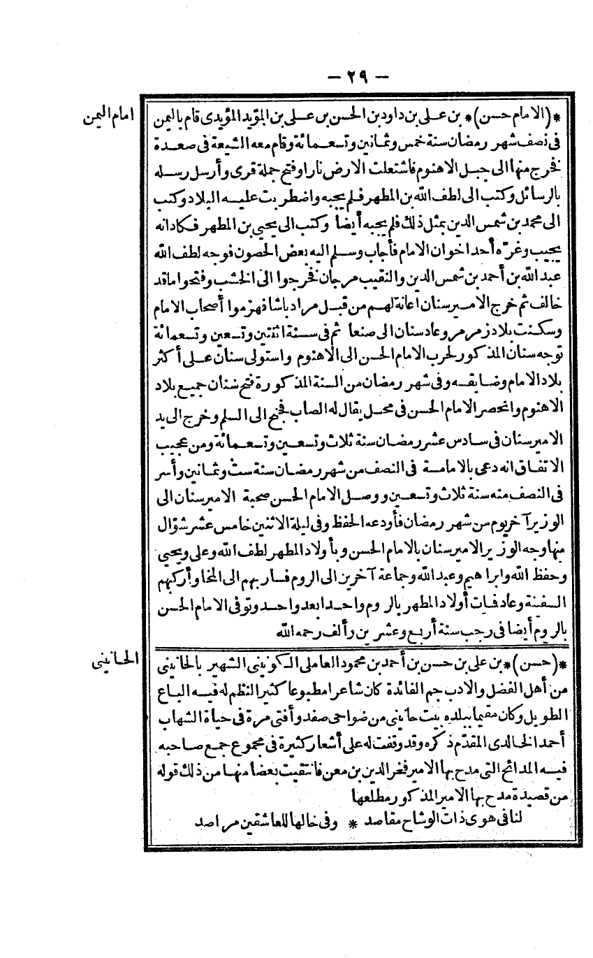 الإِمَام حسن بن عَليّ بن دَاوُد بن الْحسن بن عَليّ بن الْمُؤَيد المؤيدي قَامَ بِالْيمن فِي نصف شهر رَمَضَان سنة خمس وَثَمَانِينَ وَتِسْعمِائَة وَقَامَ مَعَه الشِّيعَة فِي صعدة فَخرج مِنْهَا إِلَى جبل الأهنوم فاشتعلت الأَرْض نَارا وَفتح جملَة قرى وَأرْسل رسله بالرسائل وَكتب إِلَى لطف الله بن المطهر فَلم يجبهُ واضطربت عَلَيْهِ الْبِلَاد وَكتب إِلَى مُحَمَّد بن شمس الدّين بِمثل ذَلِك فَلم يجبهُ أَيْضا وَكتب إِلَى يحيى بن المطهر فكاد أَنه يُجيب وغره أحد إخْوَان الإِمَام فَأجَاب وَسلم إِلَيْهِ بعض الْحُصُون فَوجه لطف الله عبد الله بن أَحْمد بن شمس الدّين والنقيب مرجان فَخَرجُوا إِلَى الْخشب وفتحوا مَا قد خَالف ثمَّ خرج الْأَمِير سِنَان أعانة لَهُم من قبل مُرَاد باشا فهزموا أَصْحَاب الإِمَام وسكنت بِلَاد زمرمر وَعَاد سِنَان إِلَى صنعا ثمَّ فِي سنة اثْنَتَيْنِ وَتِسْعين وَتِسْعمِائَة توجه سِنَان الْمَذْكُور لِحَرْب الإِمَام الْحسن إِلَى الأهنوم وَاسْتولى سِنَان على أَكثر بِلَاد الإِمَام وضايقه فِي شهر رَمَضَان من السّنة الْمَذْكُورَة فتح سِنَان جَمِيع بِلَاد الأهنوم وانحصر الإِمَام الْحسن فِي مَحل يُقَال لَهُ الصاب فنجح إِلَى السّلم وَخرج إِلَى يَد الْأَمِير سِنَان فِي سادس عشر رَمَضَان سنة ثَلَاث وَتِسْعين وَتِسْعمِائَة وَمن عَجِيب الِاتِّفَاق أَنه دعى بِالْإِمَامَةِ فِي النّصْف من شهر رَمَضَان سنة سِتّ وَثَمَانِينَ وَأسر فِي النّصْف مِنْهُ سنة ثَلَاث وَتِسْعين وَوصل الإِمَام الْحسن صُحْبَة الْأَمِير سِنَان إِلَى الْوَزير آخر يَوْم من شهر رَمَضَان فأودعه الْحِفْظ وَفِي لَيْلَة الِاثْنَيْنِ خَامِس عشر شَوَّال مِنْهَا وَجه الْوَزير الْأَمِير سِنَان بِالْإِمَامِ الْحسن وبأولاد المطهر لطف الله وَعلي وَيحيى وَحفظ الله وَإِبْرَاهِيم وَعبد الله وَجَمَاعَة آخَرين إِلَى الرّوم فَسَار بهم إِلَى المخا وأركبهم السَّفِينَة وَعَاد فَمَاتَ أَوْلَاد المطهر بالروم وَاحِدًا بعد وَاحِد وَتُوفِّي الإِمَام الْحسن بالروم أَيْضا فِي رَجَب سنة أَربع وَعشْرين وَألف رَحمَه الله