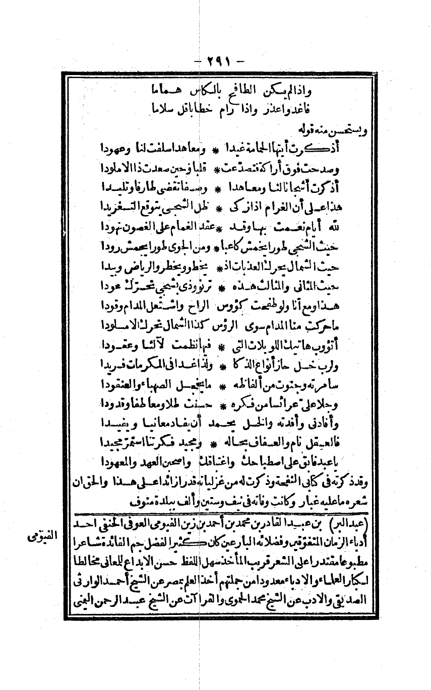 عبد الْبر بن عبد الْقَادِر بن مُحَمَّد بن أَحْمد بن زين الفيومي الْعَوْفِيّ الْحَنَفِيّ أحد أدباء الزَّمَان المتفوقين وفضلائه البارعين كَانَ كثير الْفضل جم الْفَائِدَة شَاعِرًا مطبوعاً مقتدراً على الشّعْر قريب المأخذ سهل اللَّفْظ حسن الإبداع للمعاني مخالطاً لكبار الْعلمَاء والأدباء معدوداً من جُمْلَتهمْ أَخذ الْعلم بِمصْر عَن الشَّيْخ أَحْمد الوارثي الصديقي وَالْأَدب عَن الشَّيْخ مُحَمَّد الْحَمَوِيّ والقراآت عَن الشَّيْخ عبد الرَّحْمَن اليمني