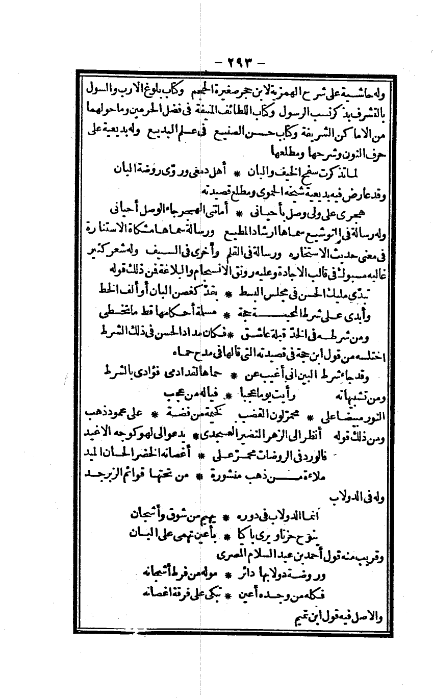 وَله رِسَالَة فِي التوشيع سَمَّاهَا إرشاد الْمُطِيع ورسالة سَمَّاهَا مشكاة الاستنارة فِي معنى حَدِيث الاستخارة ورسالة فِي الْقَلَم وَأُخْرَى فِي السَّيْف وَله شعر كثير غالبه مسبوك فِي قالب الإجادة وَعَلِيهِ رونق الانسجام والبلاغة فَمن ذَلِك قَوْله
