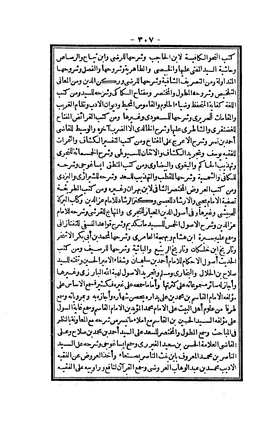 كتب النَّحْو الكافية لِابْنِ الْحَاجِب وَشَرحهَا للرضي وَابْن تياح والرصاص وحاشية السَّيِّد الْمُفْتِي عَلَيْهَا والخبيصي والطاهرية وشروحها والفصل وشروحها المتداولة وَمن التصريف الشافية وَشَرحهَا للرضي وركن الدّين وَمن الْمعَانِي التَّلْخِيص وشروحه المطول والمختصر ومفتاح السكاكي وَشَرحه للسَّيِّد وَمن كتب اللُّغَة كِفَايَة المتحفظ وضياء الحلوم والقاموس الْمُحِيط وديوان الْأَدَب ونظام الْغَرِيب والمقامات للحريري وَشَرحهَا للمسعودي وَغَيرهَا من كتب الْفَرَائِض الْمِفْتَاح للضنفري والشاطري عَلَيْهَا وَشرح الخالدي إِلَّا الضَّرْب آخِره والوسيط للْقَاضِي أَحْمد بن نسر وَشرح الْأَعْرَج على الْمِفْتَاح وَمن كتب التَّفْسِير الْكَشَّاف والثمرات للفقيه يُوسُف وَتَجْرِيد الْكَشَّاف والاتقان للسيوطي وَشرح الْخَمْسمِائَةِ للتحري وتهذيب الْحَاكِم وَالْبَغوِيّ والبيضاوي وَمن كتب الْمنطق ايساغوجي وَشَرحه للكاتي والشمسية وَشَرحهَا للقطب والتهذيب للسعد وَشَرحه للشيرازي واليزدي وَمن كتب الْعرُوض الْمُخْتَصر الشافي لِابْنِ بهران وَغَيره وَمن كتب الطَّرِيقَة تصفية الامام يحيى والإرشاد للعبسي وكنز الرشاد للْإِمَام عز الدّين وَكتاب الْبركَة للحبيشي وَغَيرهَا وَفِي أصُول الدّين المعيار للنجري والمنهاج للقرشي وَشَرحه للْإِمَام عز الدّين وَشرح الْأُصُول الْخمس للسَّيِّد مانكديم وَشرح قَوَاعِد النَّسَفِيّ للتفتازاني وَسمع عَلَيْهِ سيرة ابْن هِشَام وبهجة العامري وَشَرحهَا لمُحَمد بن أبي بكر الأشخر وتاريخ ابْن خلكان وتاريخ الرّبيع والبائية وَشَرحهَا للرصيف وَمن كتب الحَدِيث أصُول الْأَحْكَام للْإِمَام أَحْمد بن سُلَيْمَان وشفاء الْأَمِير الْحُسَيْن وتتمته للسَّيِّد صَلَاح بن الْحَلَال وَالْبُخَارِيّ وَمُسلم وَتَجْرِيد الْأُصُول لهبة الله الْبَارِزِيّ وَغَيرهَا وَأَجَازَ لَهُ سَائِر مسموعاته على كثرتها وأماما سَمعه على غَيره فكثير فَسمع الأساس على مُؤَلفه الإِمَام الْقَاسِم بن مُحَمَّد بن عَليّ بداره بحصن شهاره وَأَجَازَهُ بِهِ وبمرورياته وَسمع طرفا من عُلُوم أهل الْبَيْت على الإِمَام مُحَمَّد الْمُؤَيد بن الإِمَام الْقَاسِم وَسمع غَايَة السول على مُؤَلفه السَّيِّد الْحُسَيْن بن الْقَاسِم مَعَ إملاء مَا تيَسّر من شَرحه مَعَ المعاونة بِالنّظرِ فِي المباحث وَسمع المطول والمختصر للسعد على السَّيِّد أَحْمد بن مُحَمَّد بن صَلَاح وعَلى القَاضِي الْعَلامَة الْحسن بن سعيد الفيرري وَسمع ايساغوجي وَشَرحه على السَّيِّد النَّاصِر بن مُحَمَّد الْمَعْرُوف بِابْن بنت النَّاصِر بِصَنْعَاء وَأخذ الْعرُوض عَن الْفَقِيه الأديب مُحَمَّد بن عبد الْوَهَّاب الْعَرُوضِي وَسمع الْقُرْآن لنافع وراوييه على الْفَقِيه