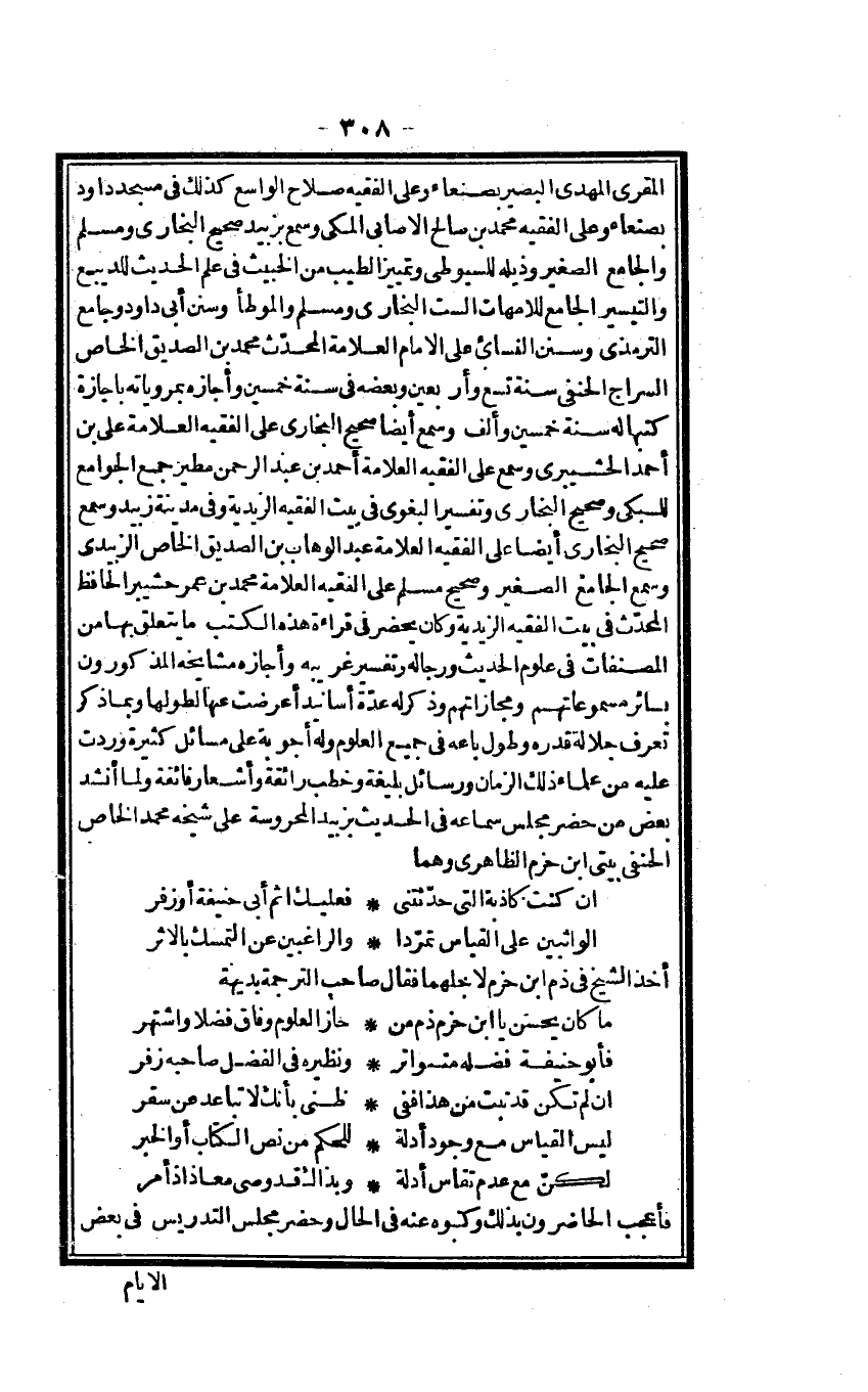 الْمقري الْمهْدي الْبَصِير بِصَنْعَاء وعَلى الْفَقِيه صَلَاح الْوَاسِع كَذَلِك فِي مَسْجِد دَاوُد بِصَنْعَاء وعَلى الْفَقِيه مُحَمَّد بن صَالح الأصابي الْمَكِّيّ وَسمع بزييد صَحِيح البُخَارِيّ وَمُسلم وَالْجَامِع الصَّغِير وذيله للسيوطي وتمييز الطّيب من الْخَبيث فِي علم الحَدِيث للديبع والتيسير الْجَامِع للأمهات السِّت البُخَارِيّ وَمُسلم والموطأ وَسنَن أبي دَاوُد وجامع التِّرْمِذِيّ وَسنَن النَّسَائِيّ على الإِمَام الْعَلامَة الْمُحدث مُحَمَّد بن الصّديق الْخَاص السراج الخنفي سنة تسع وَأَرْبَعين وَبَعضه فِي سنة خمسين وَأَجَازَهُ بمرورياته بِإِجَازَة كتبهَا لَهُ سنة خمسين وَألف وَسمع أَيْضا صَحِيح البُخَارِيّ على الْفَقِيه الْعَلامَة عَليّ بن أَحْمد الحشيبري وَسمع على الْفَقِيه الْعَلامَة أَحْمد بن عبد الرَّحْمَن مطير جمع الْجَوَامِع للسبكي وصحيح البُخَارِيّ وَتَفْسِير الْبَغَوِيّ فِي بَيت الْفَقِيه الزيدية وَفِي مَدِينَة زبيد وَسمع صَحِيح البُخَارِيّ أَيْضا على الْفَقِيه الْعَلامَة عبد الْوَهَّاب بن الصّديق الْخَاص الزبيدِيّ وَسمع الْجَامِع الصَّغِير وصحيح مُسلم على الْفَقِيه الْعَلامَة مُحَمَّد بن عمر حشيبر الْحَافِظ الْمُحدث فِي بَيت الْفَقِيه الزيدية وَكَانَ يحضر فِي قِرَاءَة هَذِه الْكتب مَا يتَعَلَّق بهَا من المصنفات فِي عُلُوم الحَدِيث وَرِجَاله وَتَفْسِير غَرِيبَة وَأَجَازَهُ مشايخه المذكورون بِسَائِر مسموعاتهم ومجازاتهم وَذكر لَهُ عدَّة أَسَانِيد أَعرَضت عَنْهَا لطولها وَبِمَا ذكر تعرف جلالة قدره وَطول بَاعه فِي جَمِيع الْعُلُوم وَله أجوبة على مسَائِل كَثِيرَة وَردت عَلَيْهِ من عُلَمَاء ذَلِك الزَّمَان ورسائل بليغة وخطب رائقة وأشعار فائقة وَلما أنْشد بعض من حضر مجْلِس سَمَاعه فِي الحَدِيث بزبيد المحروسة على شَيْخه مُحَمَّد الْخَاص الحني بَيْتِي ابْن حزم الظَّاهِرِيّ وهما