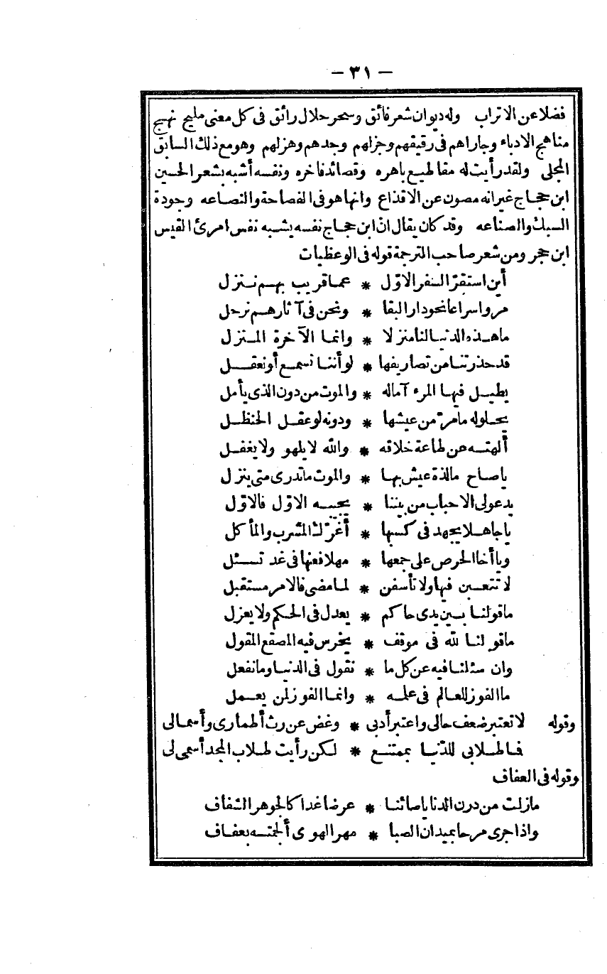 فضلا عَن الأتراب وَله ديوَان شعر فائق وسحر حَلَال رائق فِي كل معنى مليح نهيج مناهج الأدباء وجاراهم فِي رقيقهم وجزلهم وجدهم وهزلهم وَهُوَ مَعَ ذَلِك السَّابِق المجلي وَلَقَد رَأَيْت لَهُ مقاطيع باهرة وقصائد فاخرة وَنَفسه أشبه بِشعر الْحُسَيْن ابْن حجاج غيرانه مصون عَن الإقذاع وَأَنَّهَا هُوَ فِي الفصاحة والنصاعة وجودة السبك والصناعة وَقد كَانَ يُقَال أَن ابْن حجاج نَفسه يشبه نفس امْرِئ الْقَيْس ابْن حجر وَمن شعر صَاحب التَّرْجَمَة قَوْله فِي الوعظيات
