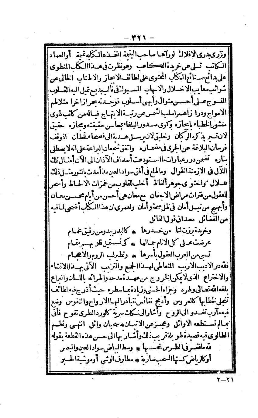 وتزرى بدرى الأفلاك لَو رَآهَا صَاحب الْيَتِيمَة اتخذها لكتابة تَمِيمَة أَو الْعِمَاد الْكَاتِب تسلى عَن خريدة الكاعب وَهُوَ نظرت فِي هَذَا الْكتاب المنطوي على بَدَائِع صنائع الْكتاب المحتوي على لطائف الإيجاز والإطناب الْخَالِي عَن شوائب معايب الْإِخْلَال والإسهاب المسبوك فِي قالب بديع تميل إِلَيْهِ الْقُلُوب المنسوج على أحسن منوال وأبهى أسلوب فَوَجَدته بحراً زاخراً متلاطم الأمواج ودراً زاهراً سلب الشَّمْس عَن رُتْبَة الابتهاج فيا لَهُ من كَاتب طوى منشور الخطباء بإيجازه وكوى صُدُور البلغاء بمحاسن حَقِيقَته ومجازه حقيق لِأَن تسير بِذكرِهِ الركْبَان وخليق لِأَن يُرْسل هَدِيَّة إِلَى فصحاء فطحان إِذْ وقف فرسَان البلاغة عَن الجري فِي مضماره وَاتفقَ شجعان البراعة على أَنه لَا يصطلى بناره تضمن دُرَر عِبَارَات مَا اسْتوْدعت أصداف الآذان إِلَى الْآن أَمْثَال تِلْكَ اللآل فِي الْأَزْمِنَة الخوال وَمَا طلع فِي أفق سَواد الْعين مذ أمدت بِالنورِ وَمثل ذَلِك هِلَال واختوى جَوْهَر أَلْفَاظ أخلب للقلوب من غمزات الألحاظ وأسحر للعقول من فترات مراض الأجفان مَعَ معَان هِيَ أحسن من أَيَّام محسن معَان وأبهج من نيل أَمَان فِي ظلّ صِحَة وأمان ولعمري أَن هَذَا الْكتاب أضحى لما فِيهِ من الْفَضَائِل مصداق قَول الْقَائِل