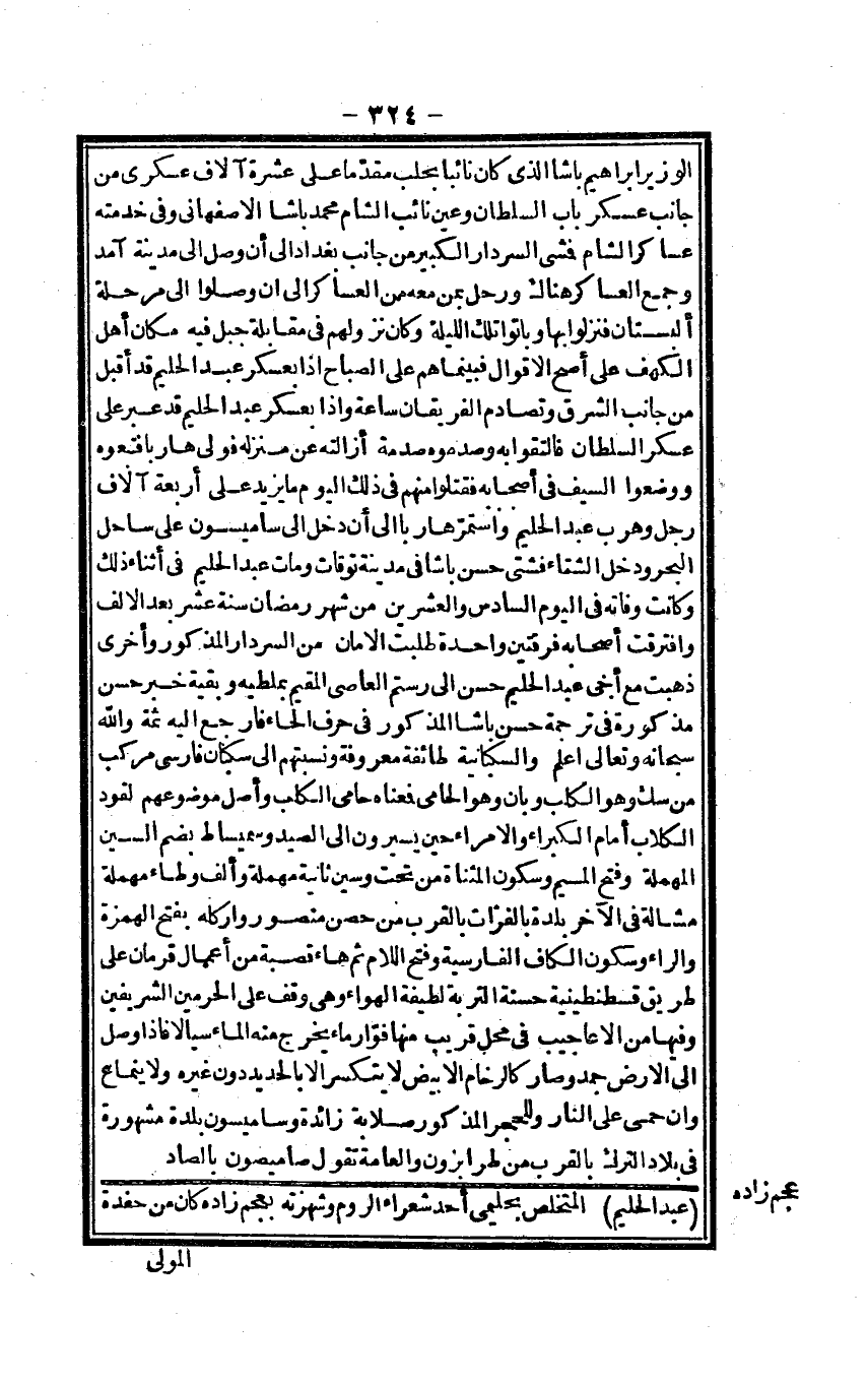 الْوَزير إِبْرَاهِيم باشا الَّذِي كَانَ نَائِبا بحلب مقدما على عشرَة آلَاف عسكري من جَانب عَسْكَر بَاب السُّلْطَان وَعين نَائِب الشَّام مُحَمَّد باشا الْأَصْفَهَانِي وَفِي خدمته عَسَاكِر الشَّام فَمشى السِّرّ دَار الْكَبِير من جَانب بَغْدَاد إِلَى أَن وصل إِلَى مَدِينَة آمد وَجمع العساكر هُنَاكَ ورحل بِمن مَعَه من العساكر إِلَى أَن وصلوا إِلَى مرحلة الْبُسْتَان فنزلوا بهَا وَبَاتُوا تِلْكَ اللَّيْلَة وَكَانَ نزولهم فِي مُقَابلَة جبل فِيهِ مَكَان أهل الْكَهْف على أصح الْأَقْوَال فَبَيْنَمَا هم على الصَّباح إِذا بعسكر عبد الْحَلِيم قد أقبل من جَانب الشرق وتصادم الْفَرِيقَانِ سَاعَة وَإِذا بعسكر عبد الْحَلِيم قد عبر على عَسْكَر السُّلْطَان فَالْتَقوا بِهِ وصدموه صدمة أزالته عَن منزله فولى هَارِبا فتبعوه وَوَضَعُوا السَّيْف فِي أَصْحَابه فَقتلُوا مِنْهُم فِي ذَلِك الْيَوْم مَا يزِيد على أَرْبَعَة آلَاف رجل وهرب عبد الْحَلِيم واستمرّ هَارِبا إِلَى أَن دخل إِلَى ساميسون على سَاحل الْبَحْر وَدخل الشتَاء فشتى حسن باشا فِي مَدِينَة توقات وَمَات عبد الْحَلِيم فِي أثْنَاء ذَلِك وَكَانَت وَفَاته فِي الْيَوْم السَّادِس وَالْعِشْرين من شهر رَمَضَان سنة عشر بعد الْألف وافترقت أَصْحَابه فرْقَتَيْن وَاحِدَة طلبت الْأمان من السردار الْمَذْكُور وَأُخْرَى ذهبت مَعَ أخي عبد الْحَلِيم حسن إِلَى رستم العَاصِي الْمُقِيم بملطية وَبَقِيَّة خبر حسن مَذْكُورَة فِي تَرْجَمَة حسن باشا الْمَذْكُور فِي حرف الْحَاء فَارْجِع إِلَيْهِ ثمَّة وَالله سُبْحَانَهُ وَتَعَالَى أعلم والسكبانية طَائِفَة مَعْرُوفَة ونسبتهم إِلَى سكبان فَارسي مركب من سك وَهُوَ الْكَلْب وَبَان وَهُوَ الحامي فَمَعْنَاه حامي الْكَلْب وأصل موضوعهم لقود الْكلاب أَمَام الكبراء والأمراء حِين يَسِيرُونَ إِلَى الصَّيْد وسميساط بِضَم السِّين الْمُهْملَة وَفتح الْمِيم وَسُكُون الْمُثَنَّاة من تَحت وسين ثَانِيَة مُهْملَة وَألف وطاء مُهْملَة مشالة فِي الآخر بَلْدَة بالفرات بِالْقربِ من حصن مَنْصُور واركله بِفَتْح الْهمزَة وَالرَّاء وَسُكُون الْكَاف الفارسية وَفتح اللَّام ثمَّ هَاء قَصَبَة من أَعمال قرمان على طَرِيق قسطنطينية حَسَنَة التربة لَطِيفَة الْهَوَاء وَهِي وقف على الْحَرَمَيْنِ الشريفين وفيهَا من الْأَعَاجِيب فِي مَحل قريب مِنْهَا فوار مَاء يخرج مِنْهُ المَاء سيالاً فَإِذا وصل إِلَى الأَرْض جمد وَصَارَ كالرخام الْأَبْيَض لَا يتكسر إِلَّا بالحديد دون غَيره وَلَا ينماع وَإِن حمى على النَّار وللحجر الْمَذْكُور صلابة زَائِدَة وساميسون بَلْدَة مَشْهُورَة فِي بِلَاد التّرْك بِالْقربِ من طرابزون والعامة تَقول صاميصون بالصَّاد