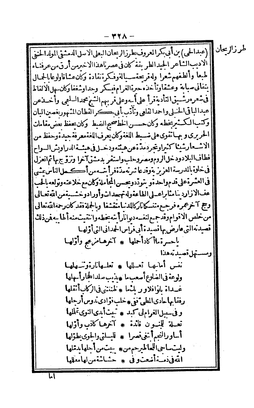 عبد الْحَيّ بن أبي بكر الْمَعْرُوف بطرز الريحان البعلي الأَصْل الدِّمَشْقِي المولد الْحَنَفِيّ الأديب الشَّاعِر الْجيد الطَّرِيقَة كَانَ فِي عصرنا هَذَا الْأَخير من أرق من عَرفْنَاهُ طبعا وألطفهم شعرًا وَله قريحة سيالة وفكرة نقادة وَكَانَ عشاقا ولوعا بالجمال يتفانى صبَابَة وعشقا وتأخذه حيرة الغرام فيسكر وجدا وشغفا وَكَانَ سهل الْأَلْفَاظ فِي شعر رَشِيق التأدية قَرَأَ على أَبِيهِم وعَلى قريبهم الشَّيْخ مُحَمَّد السليمي وَأخذ عَن عبد الباقي الْحَنْبَلِيّ وَأحمد القلعي وتأدب بِأبي بكر الْقطَّان الْمَشْهُور بغصين البان وَكتب الْكثير بِخَطِّهِ وَكَانَ حسن الْخط صَحِيح الضَّبْط وَكَانَ يحفظ بعض مقامات الحريري وَبهَا تقوى على ضبط اللُّغَة وَكَانَ بعرف اللُّغَة معرفَة جَيِّدَة وَحفظ من الْأَشْعَار شَيْئا كثيرا وتجرد مُدَّة على هَيئته وَدخل فِي هَيْئَة الدراويش السواح فَطَافَ الْبِلَاد وَدخل الرّوم ومصر وحلب وَاسْتقر بِدِمَشْق آخرا وَتزَوج بهَا ثمَّ انْعَزل فِي خلْوَة بِالْمَدْرَسَةِ العزيزية وَقد عاشرته مُدَّة فرأيته من أكمل النَّاس يمشي فِي الْعشْرَة على قدم وَاحِدَة يتودد وَيحسن المجاملة وَكَانَ مَعَ خلاعته وتولعه بالحب عف الأزار دين مثابرا على الطَّاعَة وَله تهجدات وأوراد وخشية من الله تَعَالَى وَحج آخر عمره فَرجع متنسكا تَارِكًا للدنيا متقشفا وَبِالْجُمْلَةِ فقد كَانَ رَحمَه الله تَعَالَى من خلص الأقوام وَقد جمع لنَفسِهِ ديوانا رَأَيْته بِخَطِّهِ وانتقيت مِنْهُ أطايبه فَمن ذَلِك قصيدته الَّتِي عَارض بهَا قصيدة أبي فراس الحمداني الَّتِي أَولهَا