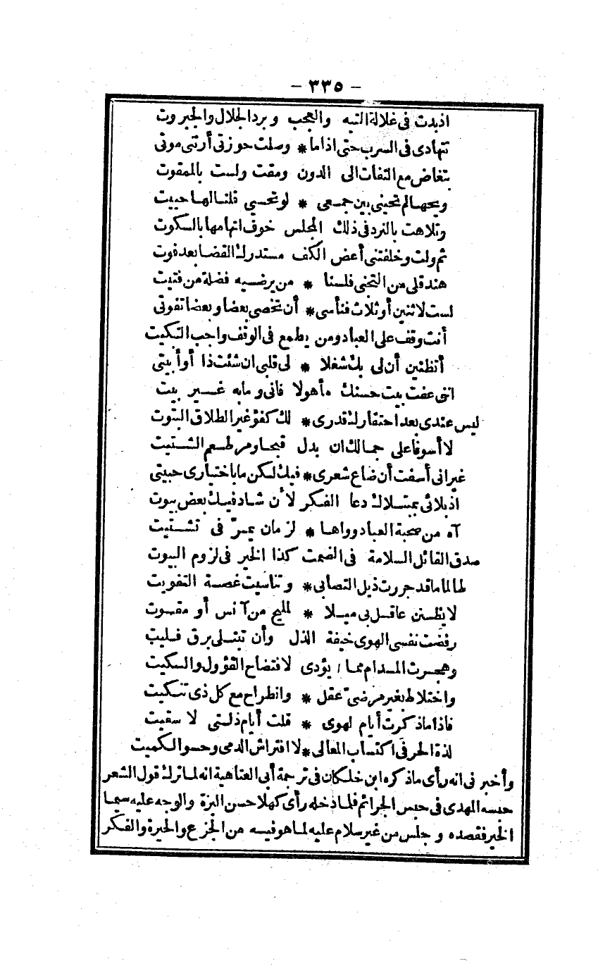 (لَذَّة الْحرفِي اكْتِسَاب الْمَعَالِي ... لَا افتراش الدمى وحسو الْكُمَيْت ... وَأَخْبرنِي فِي أَنه رأى مَا ذكره ابْن خلكان فِي تَرْجَمَة ابْن الْعَتَاهِيَة أَنه لما ترك قَول الشّعْر حَبسه الْمهْدي فِي حبس الجرائم فَلَمَّا دخله رأى كهلا حسن الْبرة وَالْوَجْه عَلَيْهِ سِيمَا الْخَيْر فقصده وَجلسَ من غير سَلام عَلَيْهِ لما هُوَ فِيهِ من الْجزع والحيرة والفكر