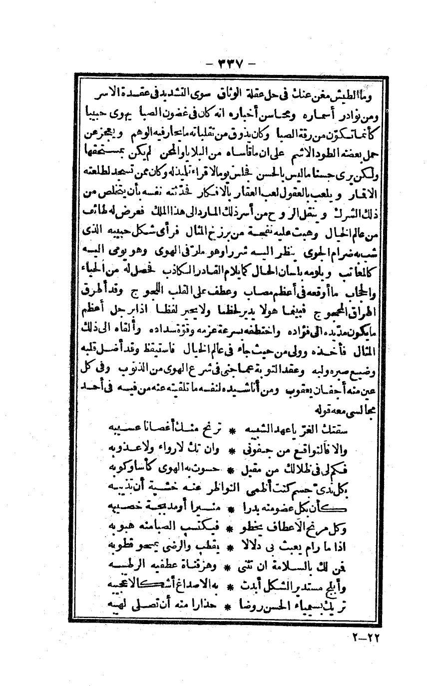 وَمن نَوَادِر أسماره ومحاسن أخباره أَنه كَانَ فِي غُضُون الصِّبَا يهوى حبيبا كَأَنَّمَا تكون من رقة الصِّبَا وَكَانَ يَذُوق من تقلباته مَا يحر فِيهِ الْوَهم ويعجز عَن حمل بعضه الطود الأشم على أَن مَا قاساه من البلايا والمحن لم يكن بمستحقها وَلَكِن يرى حسنا مَا لَيْسَ بالْحسنِ فَجَلَسَ يَوْمًا الإقراء تلميذ لَهُ وَكَانَ مِمَّن تسْجد لطلعته الأقمار ويلعب بالعقول لعب الْعقار بالأفكار فَحَدَّثته نَفسه بِأَن يتَخَلَّص من ذَلِك الشّرك وينقل الرّوح من أٍ سر ذَلِك المارد إِلَى هَذَا الْملك فَعرض لَهُ طائف من عَالم الخيال وهبت عَلَيْهِ نفحة من برزخ الْمِثَال فَرَأى شكل حَبِيبه الَّذِي شب بِهِ ضرام الجوى ينظر إِلَيْهِ شررا وَهُوَ مار فِي الْهوى وَهُوَ يومي إِلَيْهِ كالمعاتب ويلومه بِلِسَان الْحَال كَمَا يلام الْقَادِر الْكَاذِب فَحصل لَهُ من الْحيَاء والحجاب مَا أوقعه فِي أعظم مصاب وَعطف على الْقلب اللجوج وَقد أطرق إطراق المحجوج فَبَيْنَمَا هُوَ لَا يُدِير لحظا وَلَا يحير لفظا إِذا بِرَجُل أعظم مَا يكون مد يَده إِلَى فُؤَاده واختطفه بِسُرْعَة عزمه وَقُوَّة سداده وألقاه إِلَى ذَلِك الْمِثَال فَأَخذه وَولي من حَيْثُ جَاءَ فِي عَالم الخيال فَاسْتَيْقَظَ وَقد أضلّ قلبه وضيع صبره وليه وَعقد التَّوْبَة عَمَّا جنى فِي شرع الْهوى من الذُّنُوب وَفِي كل عين مِنْهُ أحفان وَيَعْقُوب وَمن أناشده لنَفسِهِ مَا تلقيته عَنهُ من فِيهِ فِي أحد مجالسي مَعَه قَوْله