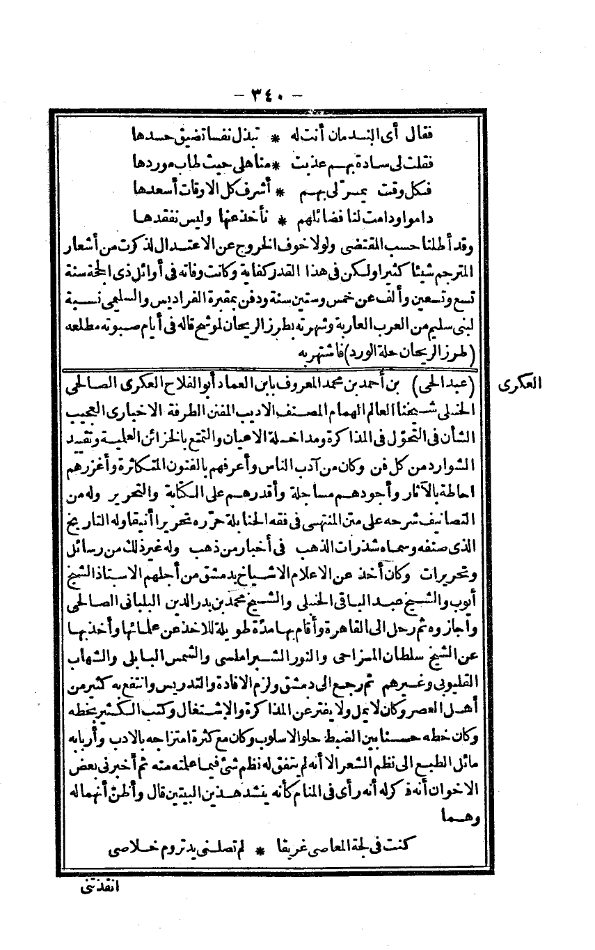 عبد الْحَيّ بن أَحْمد بن مُحَمَّد الْمَعْرُوف بِابْن الْعِمَاد أَبُو الْفَلاح العكري الصَّالِحِي الْحَنْبَلِيّ شَيخنَا الْعَالم الْهمام المُصَنّف الأديب المفنن الطرفة الإخباري العجيب الشَّأْن فِي التَّحَوُّل فِي المذاكرة ومداخلة الْأَعْيَان والتمتع بالخزائن العلمية وَتَقْيِيد الشوارد من كل فن وَكَانَ من آدب النَّاس وأعرفهم بالفنون المتكاثرة وأغزرهم إحاطة بالآثار وأجودهم مساجلة وأقدرهم على الْكِتَابَة والتحرير وَله من التصانيف شَرحه على متن الْمُنْتَهى فِي فقه الْحَنَابِلَة حَرَّره تحريراً أنيقاً وَله التَّارِيخ الَّذِي صنفه وَسَماهُ شذرات الذَّهَب فِي أَخْبَار من ذهب وَله غير ذَلِك من رسائل وتحريرات وَكَانَ أَخذ عَن الْأَعْلَام الْأَشْيَاخ بِدِمَشْق من أَجلهم الْأُسْتَاذ الشَّيْخ أَيُّوب وَالشَّيْخ عبد الْبَاقِي الْحَنْبَلِيّ وَالشَّيْخ مُحَمَّد بن بدر الدّين البلباني الصَّالِحِي وأجازوه ثمَّ رَحل إِلَى الْقَاهِرَة وَأقَام بهَا مُدَّة طَوِيلَة للأخذ عَن علمائها وَأخذ بهَا عَن الشَّيْخ سُلْطَان المزاحي والنور الشبراملسي وَالشَّمْس البابلي والشهاب القليوبي وَغَيرهم ثمَّ رَجَعَ إِلَى دمشق وَلزِمَ الإفادة والتدريس وانتفع بِهِ كثير من أهل الْعَصْر وَكَانَ لَا يمل وَلَا يفتر عَن المذاكرة والاشتغال وَكتب الْكثير بِخَطِّهِ وَكَانَ خطه حسنا بَين الضَّبْط حُلْو الأسلوب وَكَانَ مَعَ كَثْرَة امتزاجه بالأدب وأربابه مائل الطَّبْع إِلَى نظم الشّعْر إِلَّا أَنه لم يتَّفق لَهُ نظم شَيْء فِيمَا عَلمته مِنْهُ ثمَّ أَخْبرنِي بعض الإخوان أَنه ذكر لَهُ أَنه رأى فِي الْمَنَام كَأَنَّهُ ينشد هذَيْن الْبَيْتَيْنِ قَالَ وأظن أَنَّهُمَا لَهُ وهما