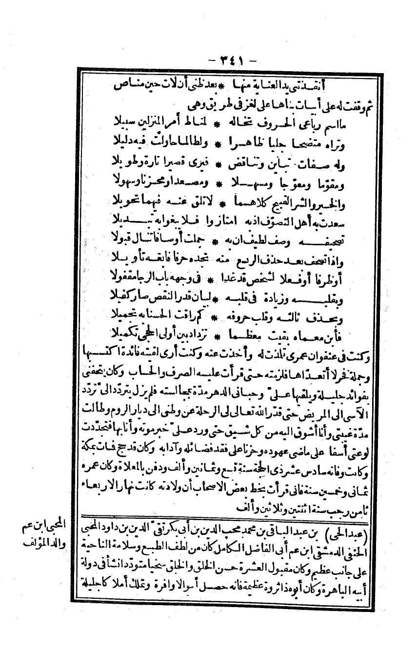 عبد الْحَيّ بن عبد الْبَاقِي بن مُحَمَّد محب الدّين بن أبي بكر تَقِيّ الدّين بن دَاوُد المحبي الْحَنَفِيّ الدِّمَشْقِي ابْن عَم أبي الْفَاضِل الْكَامِل كَانَ من لطف الطَّبْع وسلامة النَّاحِيَة على جَانب عَظِيم وَكَانَ مَقْبُول الْعشْرَة حسن الْخلق والخلق سخياً متودداً نَشأ فِي دولة أَبِيه الباهرة وَكَانَ أَبوهُ ذَا ثروة عَظِيمَة فَإِنَّهُ حصلا أَمْوَالًا وافرة وتملك أملاكاً جليلة