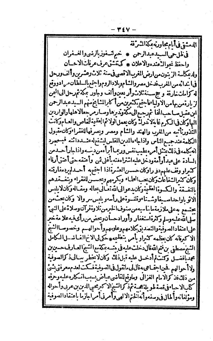 وَكَثْرَة اسْتِغْفَار وأوراد حسان ويحض من رَأْي فِيهِ عَلامَة خير على اعْتِقَاد الصُّوفِيَّة والتصديق بكلامهم وعلومهم وأحوالهم وخصوصاً الشَّيْخ الْأَكْبَر فَإِنَّهُ كَانَ يعظمه كثيرا وَيَأْمُر بتعظيمه حكى لي الْأَخ الْفَاضِل الْكَامِل الشَّيْخ مصطفى بن فتح الله قَالَ دخلت عَلَيْهِ فِي بَيته بِمَكَّة مَعَ الشَّيْخ الْعَارِف حُسَيْن بن مُحَمَّد با فضل وَكنت لم أَدخل عَلَيْهِ قبل ذَلِك وَكَانَ لَا يخْطر ببالي ذكر الصُّوفِيَّة وَلَا أَحْوَالهم فحين اجتماعي بِهِ قَالَ لي مَا تَقول فِي الصُّوفِيَّة فَسكت لعدم معرفتي بِشَيْء من ذَلِك فَذكر الإِمَام الْغَزالِيّ وَمَا وَقع للْقَاضِي عِيَاض بِسَبَب إِنْكَاره عَلَيْهِ وَحَرقه كتاب الْأَحْيَاء فِي قصَّة طَوِيلَة عَجِيبَة ثمَّ ذكر الشَّيْخ الْأَكْبَر محيي الدّين بن عَرَبِيّ وأحواله ومؤلفاته وَأطَال فِي وَصفه وَأَنه الْخَتْم الإلهي وَأَمرَنِي أمرا جَازِمًا باعتقاد الصُّوفِيَّة
