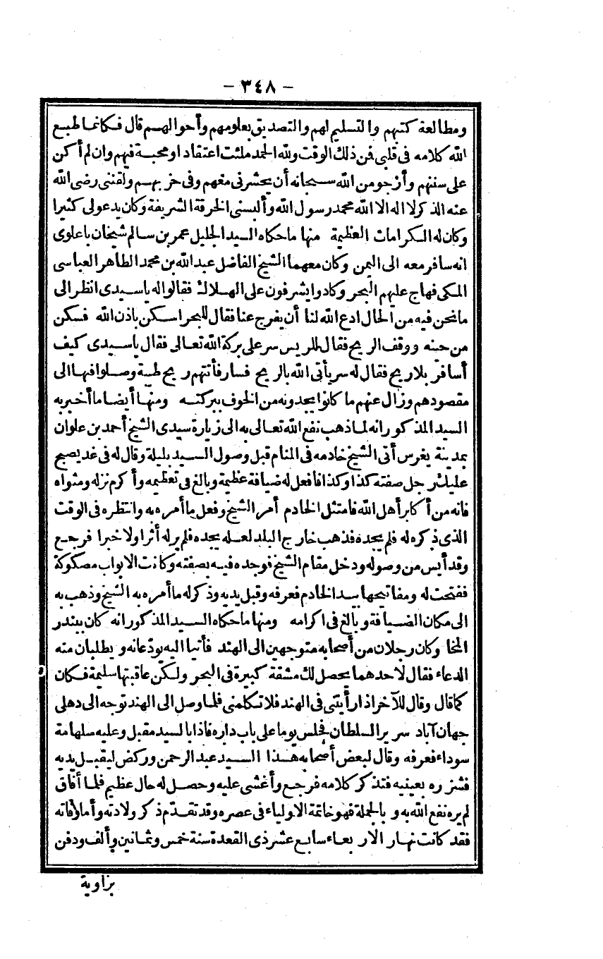 ومطالعة كتبهمْ وَالتَّسْلِيم لَهُم والتصديق بعلومهم وأحوالهم قَالَ فَكَأَنَّمَا طبع الله كَلَامه فِي قلبِي فَمن ذَلِك الْوَقْت وَللَّه الْحَمد ملئت اعتقادا ومحبة فيهم وَإِن لم أكن على سُنَنهمْ وَأَرْجُو من الله سُبْحَانَهُ أَن يحشرني مَعَهم وَفِي حزبهم ولقنني رَضِي الله عَنهُ الذّكر لَا إِلَه إِلَّا الله مُحَمَّد رَسُول الله وألبسني الْخِرْقَة الشَّرِيفَة وَكَانَ يَدْعُو لي كثيرا وَكَانَ لَهُ الكرامات الْعَظِيمَة مِنْهَا مَا حَكَاهُ السَّيِّد الْجَلِيل عمر بن سَالم شَيْخَانِ يَا علوي أَنه سَافر مَعَه إِلَى الْيمن وَكَانَ مَعَهُمَا الشَّيْخ الْفَاضِل عبد الله بن مُحَمَّد الطَّاهِر العباسي الْمَكِّيّ فهاج عَلَيْهِم الْبَحْر وكادوا يشرفون على الْهَلَاك فَقَالُوا لَهُ يَا سَيِّدي انْظُر إِلَى مَا نَحن فِيهِ من الْحَال ادْع الله لنا أَن يفرج عَنَّا فَقَالَ للبحر اسكن بِإِذن الله فسكن من حِينه ووقف الرّيح فَقَالَ للريس سر على بركَة الله تَعَالَى فَقَالَ يَا سَيِّدي كَيفَ أسافر بِلَا ريح فَقَالَ لَهُ سر يَأْتِي الله بِالرِّيحِ فَسَار فأتتهم ريح طيبَة وصلوا فِيهَا إِلَى مقصودهم وَزَالَ عَنْهُم مَا كَانُوا يجدونه من الْخَوْف ببركته وَمِنْهَا أَيْضا مَا أخبر بِهِ السَّيِّد الْمَذْكُور أَنه لما ذهب نفع الله تَعَالَى بِهِ إِلَى زِيَارَة سَيِّدي الشَّيْخ أَحْمد بن علوان بِمَدِينَة يغْرس أَتَى الشَّيْخ خادمه فِي الْمَنَام قبل وُصُول السَّيِّد بليلة وَقَالَ لَهُ فِي غَد يصبح عَلَيْك رجل صفته كَذَا وَكَذَا فأفعل لَهُ ضِيَافَة عَظِيمَة وَبَالغ فِي تَعْظِيمه وَأكْرم نزله ومثواه فَإِنَّهُ من أكَابِر أهل الله فامتثل الْخَادِم أَمر الشَّيْخ وَفعل مَا أمره بِهِ وانتظره فِي الْوَقْت الَّذِي ذكره لَهُ فَلم يجده فَذهب خَارج الْبَلَد لَعَلَّه يجده فَلم ير لَهُ أثرا وَلَا خَبرا فَرجع وَقد أيس من وُصُوله وَدخل مقَام الشَّيْخ فَوَجَدَهُ فِيهِ بِصفتِهِ وَكَانَت الْأَبْوَاب مصكوكة ففتحت لَهُ ومفاتيحها بيد الْخَادِم فَعرفهُ وَقبل يَدَيْهِ وَذكر لَهُ مَا أمره بِهِ الشَّيْخ وَذهب بِهِ إِلَى مَكَان الضِّيَافَة وَبَالغ فِي إكرامه وَمِنْهَا مَا حَكَاهُ السَّيِّد الْمَذْكُور أَنه كَانَ ببندر المخا وَكَانَ رجلَانِ من أَصْحَابه متوجهين إِلَى الْهِنْد فَأتيَا إِلَيْهِ يودعانه ويطلبان مِنْهُ الدُّعَاء فَقَالَ لأَحَدهمَا يحصل لَك مشقة كَبِيرَة فِي الْبَحْر وَلَكِن عَاقبَتهَا سليمَة فَكَانَ كَمَا قَالَ وَقَالَ للْآخر إِذا رَأَيْتنِي فِي الْهِنْد فَلَا تكلمني فَلَمَّا وصل إِلَى الْهِنْد وَتوجه إِلَى دهلي جهان آباد سَرِير السُّلْطَان فَجَلَسَ يَوْمًا على بَاب دَاره فَإِذا أَبَا السَّيِّد مقبل وَعَلِيهِ سلهامة سَوْدَاء فَعرفهُ وَقَالَ لبَعض أَصْحَابه هَذَا السَّيِّد عبد الرَّحْمَن وركض ليقبل يَدَيْهِ فشزره بِعَيْنيهِ فَتذكر كَلَامه فَرجع وأغشى عَلَيْهِ وَحصل لَهُ حَال عَظِيم فَلَمَّا أَفَاق لم يره نفع الله بِهِ وَبِالْجُمْلَةِ فَهُوَ خَاتِمَة الْأَوْلِيَاء فِي عصره وَقد تقدم ذكر وِلَادَته وَأما وَفَاته فقد كَانَت نَهَار الْأَرْبَعَاء سَابِع عشر ذِي الْقعدَة سنة خمس وَثَمَانِينَ وَألف وَدفن