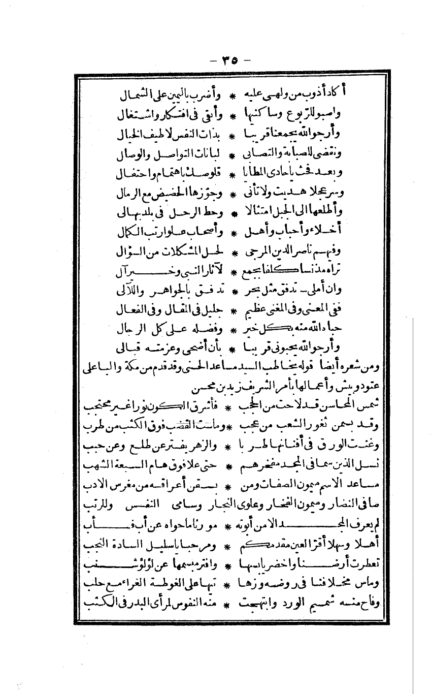 وَمن شعره أَيْضا قَوْله يُخَاطب السَّيِّد مساعد الْحسنى وَقد قدم من مَكَّة واليا على عتود وبيش وأعمالها بِأَمْر الشريف زيد بن محسن