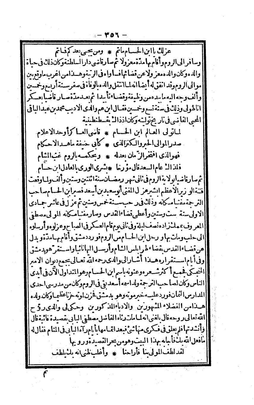ثمَّ صَار قَاضِيا بِولَايَة الرّوم فِي ثَانِي شهر رَمَضَان سنة اثْنَتَيْنِ وَسِتِّينَ وَألف وَلما وَقعت فتْنَة الْوَزير الْأَعْظَم ابشير عزل الْمُفْتِي أَبُو سعيد بن أسعد فصيرا بن الحسام صَاحب التَّرْجَمَة مفتيا مَكَانَهُ وَذَلِكَ فِي رَجَب سنة خمس وَسِتِّينَ ثمَّ عزل فِي عَاشر جُمَادَى الأولى سنة سِتّ وَسِتِّينَ وَأعْطى قَضَاء الْقُدس وَصَارَ مفتيا مَكَانَهُ الْمولى مصطفى الْمَعْرُوف بممك زَاده نصف لَيْلَة وَفِي ثَانِي يَوْم قَامَ الْعَسْكَر فِي الصَّباح وعزلوه وأرسلوه إِلَى حلب وَمَات بهَا ورحل ابْن الحسام من الرّوم فورد دمشق وَأقَام بهَا مُدَّة وَبدل عَن قَضَاء الْقُدس بِقَضَاء طرابلس الشَّام وَأرْسل إِلَيْهَا نَائِبا وَاسْتقر هُوَ بِدِمَشْق وَفِي أَيَّام استقراره هَذَا أَشَارَ إِلَى وَالِدي رَحمَه الله تَعَالَى بِجمع ديوَان الْأَمِير المنجكي فَجمع أَكثر شعره وعنونه باسم ابْن الحسام وَهُوَ المتداول الْآن فِي أَيدي النَّاس وَكَانَ لصَاحب التَّرْجَمَة ولد اسْمه أسعد بَقِي فِي الرّوم وَكَانَ من مدرسي إِحْدَى الْمدَارِس الثمان فورد عَلَيْهِ خبر مَوته وَهُوَ بِدِمَشْق فَحزن لمَوْته حزنا عَظِيما وَكَانَ وَلَده هَذَا من الْفُضَلَاء الْمَشْهُورين والأدباء الْمَذْكُورين وَحكى لي وَالِدي روح الله تَعَالَى روحه قَالَ بَلغنِي أَنه لما مَاتَ رثاه الْفَاضِل مصطفى البابي بقصيدة فائية قَالَ وأنشدتها فَلم يعلق فِي فكري مِنْهَا شَيْء فَبعد إِتْمَامهَا بأيام رَآهُ البابي فِي الْمَنَام فَقَالَ لَهُ مَا فعل الله بك فَأَجَابَهُ بِهَذَا الْبَيْت وَهُوَ من بَحر القصيدة ورويها