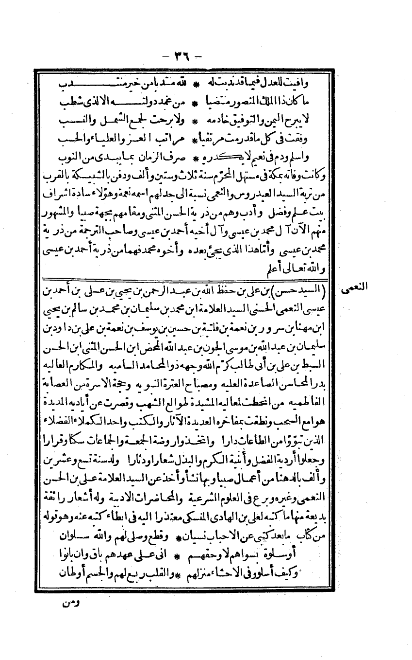 السَّيِّد حسن بن عَليّ بن حفظ الله بن عبد الرَّحْمَن بن يحيى بن عَليّ بن أَحْمد بن عِيسَى النعمي الحسني السَّيِّد الْعَلامَة ابْن مُحَمَّد بن سُلَيْمَان بن مُحَمَّد بن سَالم بن يحيى ابْن مهنا بن سرُور بن نعْمَة بن فلتية بن حُسَيْن بن يُوسُف بن نعْمَة بن عَليّ بن دَاوُد بن سُلَيْمَان بن عبد الله بن مُوسَى الجون بن عبد الله الْمَحْض ابْن الْحسن الْمثنى بِابْن الْحسن السبط بن عَليّ بن أبي طَالب كرم الله وَجهه والمحامد السامية والمكارم الْعَالِيَة بدر المحاسن الصاعدة الْعلية ومصباح العترة النَّبَوِيَّة وَحجَّة الأسرة من الْعِصَابَة الفاطمية من انحطت لمعاليه المشيدة طوالع الشهب وَقصرت على أياديه المديدة هوامع السحب ونطقت بمفاخرة العديدة الْآثَار والكتب وَاحِد الكملاء الْفُضَلَاء الَّذين تبوؤا من الطَّاعَات دَارا وَاتَّخذُوا رَوْضَة الْجُمُعَة وَالْجَمَاعَات سكنا وقرارا وَجعلُوا أردية الْفضل وأبنية الْكَرم والبذل شعارا ودثارا ولد سنة تسع وَعشْرين وَألف بالدهنا من أَعمال صَبيا وَبهَا نَشأ وَأخذ عَن السَّيِّد الْعَلامَة عَليّ بن الْحسن النعمي وغيرة وبرع فِي الْعُلُوم الشَّرْعِيَّة والمحاضرات الأدبية وَله أشعار رائقة بديعة مِنْهَا مَا كتبه لعَلي بن الْهَادِي المنسكي معتذرا إِلَيْهِ فِي إبطاء كتبه عَنهُ وَهُوَ قَوْله من كتاب