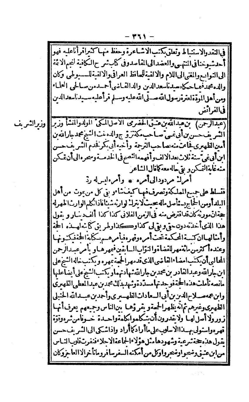 فتسلط على جَمِيع المملكة وَتصرف فِيهَا كَيفَ شَاءَ وَبَقِي كل من يَمُوت من أهل الْبَلَد أَو من الْحجَّاج يستأصل مَاله بِحَيْثُ لَا يتْرك لوَارِثه شَيْئا فَإِذا تكلم الْوَارِث ظهر لَهُ حجَّة أَن مُوَرِثه كَانَ قد اقْترض مِنْهُ فِي الزَّمن الْفُلَانِيّ كَذَا كَذَا ألف دِينَار وَيَقُول هَذَا الَّذِي أَخَذته دون حَقي وَبَقِي لي كَذَا وَكَذَا وَطَرِيق كِتَابَته لهَذِهِ الْحجَّة وأمثالها أَن كتبة المحكمة تَحت أمره وقهره فيأمرهم بِكِتَابَة الْحجَّة فيكتبونها وَعِنْده أَكثر من مائَة مهر للقضاة والنواب السَّابِقين فيمهرها وَيَأْمُر عبد الرَّحْمَن المحالبي أَن يكْتب إِمْضَاء القَاضِي الَّذِي قد مهر الْحجَّة بمهره وَيكْتب خَاله الشَّيْخ على ابْن جَار الله وَعبد الْقَادِر بن مُحَمَّد بن جَار الله شَهَادَتهمَا وَيكْتب الشَّيْخ عَليّ أَيْضا عَلَيْهَا مَا نَصه تَأَمَّلت هَذِه الْحجَّة فَوَجَدتهَا مسددة وَشهد بذلك مُحَمَّد بن عبد الْمُعْطِي الظهيري وَابْن عَمه صَلَاح الدّين بن أبي السعادات الظميري وَأحمد بن عبد الله الْحَنْبَلِيّ الظهيري وَغَيرهم ثمَّ إِنَّه يظْهر الْحجَّة ويقرؤها بَين النَّاس وجميعهم يعرف أَنَّهَا زور وَلَا أصل لَهَا وَلَا يقدرُونَ أَن يتكلموا بِكَلِمَة وَاحِدَة خوفًا من شَره وَقُوَّة قهره وَاسْتولى بِهَذَا الأسلوب على مَا أَرَادَ كَمَا أَرَادَ وَإِذا شكى إِلَى الشريف حسن يَقُول هَذِه حجَّة شَرْعِيَّة وشهودها مثل هَؤُلَاءِ الْجَمَاعَة الإجلاء فنفرت قُلُوب النَّاس من ابْن عَتيق وضجوا وضجروا وكل من أمكنه السّفر سَافر وَمَا تَأَخّر إِلَّا الْعَاجِز وَكَانَ