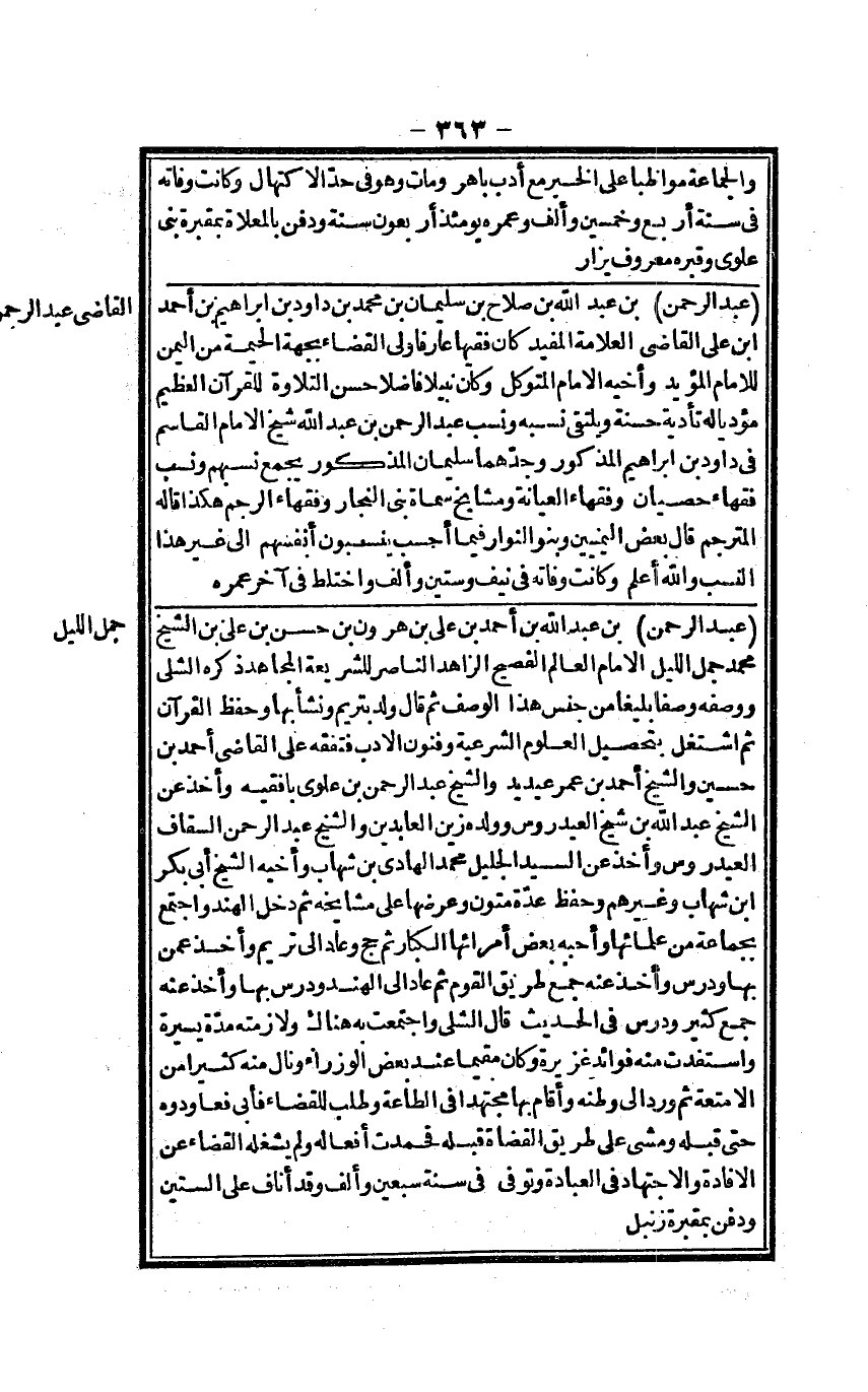عبد الرَّحْمَن بن عبد الله بن أَحْمد بن عَليّ بن هرون بن حسن بن عَليّ بن الشَّيْخ مُحَمَّد حمل اللَّيْل الإِمَام الْعَالم الفصيح الزَّاهِد النَّاصِر للشريعة الْمُجَاهِد ذكره الشلي وَوَصفه وَصفا بليغاً من جنس هَذَا الْوَصْف ثمَّ قَالَ ولد بتريم وَنَشَأ بهَا وَحفظ الْقُرْآن ثمَّ اشْتغل بتحصيل الْعُلُوم الشَّرْعِيَّة وفنون الْأَدَب فتفقه على القَاضِي أَحْمد بن حُسَيْن وَالشَّيْخ أَحْمد بن عمر عيديد وَالشَّيْخ عبد الرَّحْمَن بن علوي بافقيه وَأخذ عَن الشَّيْخ عبد الله بن شيخ العيدروس وَولده زين العابدين وَالشَّيْخ عبد الرَّحْمَن السقاف العيدروس وَأخذ عَن السَّيِّد الْجَلِيل مُحَمَّد الْهَادِي بن شهَاب وأخيه الشَّيْخ أبي بكر ابْن شهَاب وَغَيرهم وَحفظ عدّة متون وعرضها على مشايخه ثمَّ دخل الْهِنْد وَاجْتمعَ بِجَمَاعَة من علمائها وأحبه بعض أمرائها الْكِبَار ثمَّ حج وَعَاد إِلَى تريم وَأخذ عَمَّن بهَا ودرس وَأخذ عَنهُ جمع طَرِيق الْقَوْم ثمَّ عَاد إِلَى الْهِنْد ودرس بهَا وَأخذ عَنهُ جمع كثير ودرس فِي الحَدِيث قَالَ الشلي وَاجْتمعت بِهِ هُنَاكَ ولازمته مُدَّة يسيرَة واستفدت مِنْهُ فَوَائِد غزيرة وَكَانَ مُقيما عِنْد بعض الوزراء ونال مِنْهُ كثيرا من الْأَمْتِعَة ثمَّ ورد إِلَى وَطنه وَأقَام بهَا مُجْتَهدا فِي الطَّاعَة وَطلب للْقَضَاء فَأبى فعاودوه حَتَّى قبله وَمَشى على طَرِيق الْقُضَاة قبله فحمدت أَفعاله وَلم يشْغلهُ الْقَضَاء عَن الإفادة وَالِاجْتِهَاد فِي الْعِبَادَة وَتُوفِّي فِي سنة سبعين وَألف وَقد أناف على السِّتين وَدفن بمقبرة زنبل