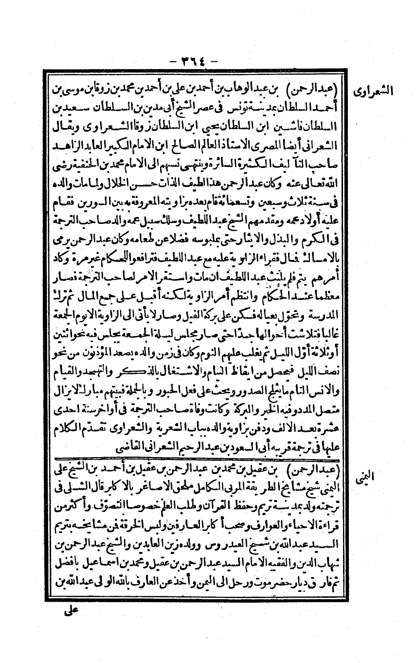 عبد الرَّحْمَن بن عبد الْوَهَّاب بن أَحْمد بن عَليّ بن أَحْمد بن مُحَمَّد بن زوقا بن مُوسَى بن أَحْمد السُّلْطَان بِمَدِينَة تونس فِي عصر الشَّيْخ أبي مَدين بن السُّلْطَان سعيد بن السُّلْطَان فاشين ابْن السُّلْطَان يحيى ابْن السُّلْطَان زوقا الشعراوي وَيُقَال الشعراني أَيْضا الْمصْرِيّ الْأُسْتَاذ الْعَام الصَّالح ابْن الإِمَام الْكَبِير العابد الزَّاهِد صَاحب التآليف الْكَثِيرَة السائرة وَيَنْتَهِي نسبهم إِلَى الإِمَام مُحَمَّد بن الْحَنَفِيَّة رَضِي الله تَعَالَى عَنهُ وَكَانَ عبد الرَّحْمَن هَذَا لطيف الذَّات حسن الْخلال وَلما مَاتَ وَالِده فِي سنة ثَلَاث وَسبعين وَتِسْعمِائَة قَامَ بعده بزاويته الْمَعْرُوفَة بَين السورين فَقَامَ عَلَيْهِ أَوْلَاد عَمه ومقدمهم الشَّيْخ عبد اللَّطِيف وسلك سَبِيل عَمه وَالِد صَاحب التَّرْجَمَة فِي الْكَرم والبذل والإيثار حَتَّى بملبوسه فضلا عَن طَعَامه وَكَانَ عبد الرَّحْمَن يرْمى بالإمساك فَمَال فُقَرَاء الزاوية عَلَيْهِ مَعَ عبد اللَّطِيف فترافعوا للحكام غير مرّة وَكَاد أَمرهم يتم فَلم يلبث عبد اللَّطِيف أَن مَاتَ وَاسْتقر الْأَمر لصَاحب التَّرْجَمَة فَصَارَ مُعظما عِنْد الْحُكَّام وانتظم أَمر الزاوية لكنه أقبل على جمع المَال ثمَّ ترك الْمدرسَة وتحوّل بعياله فسكن على بركَة الْفِيل وَصَارَ لَا يَأْتِي إِلَى الزاوية إِلَّا يَوْم الْجُمُعَة غَالِبا فتلاشت أحوالها جدا حَتَّى صَار مجْلِس لَيْلَة الْجُمُعَة يجلس فِيهِ نَحْو اثْنَيْنِ أَو ثَلَاثَة أول اللَّيْل ثمَّ يغلب عَلَيْهِم النّوم وَكَانَ فِي زمن وَالِده يصعد المؤذنون من نَحْو نصف اللَّيْل فَيحصل من إيقاظ النيام والاشتغال بِالذكر والتهجد وَالْقِيَام والأنس التَّام مَا يثلج الصُّدُور ويحث على فعل الحبور وَبِالْجُمْلَةِ فبيتهم مبارك لَا يزَال مُتَّصِل المدد وَفِيه الْخَيْر وَالْبركَة وَكَانَت وَفَاة صَاحب التَّرْجَمَة فِي أَوَاخِر سنة إِحْدَى عشرَة بعد الْألف وَدفن بزاوية وَالِده بِبَاب الشعرية والشعراوي تقدّم الْكَلَام عَلَيْهَا فِي تَرْجَمَة قريبَة أبي السُّعُود بن عبد الرَّحِيم الشعراني القَاضِي