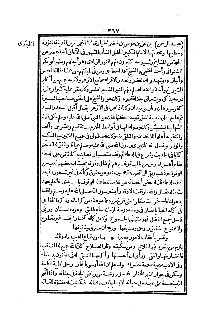 عبد الرَّحْمَن بن عَليّ بن مُوسَى بن خضر الخياري الشَّافِعِي نزيل الْمَدِينَة المنورة وخطيبها ومحدثها الإِمَام الْكَبِير الْجَلِيل الشَّأْن الْمَشْهُور فِي الْآفَاق أَخذ بِمصْر عَن الجلة من الْمَشَايِخ وشيوخه كَثِيرُونَ مِنْهُم النُّور الزيَادي وَهُوَ أَجلهم وَمِنْهُم أَبُو بكر الشنواني وَأحمد الغنيمي وَالشَّيْخ مُحَمَّد الخفاجي وَمن فِي طبقتهم من عُلَمَاء ذَلِك الْعَصْر وأجازوه وشهدوا لَهُ بِالْفَضْلِ وتصدر للإقراء بِجَامِع الْأَزْهَر ولازمه جمع من أكَابِر الشُّيُوخ وَأخذُوا عَنهُ الْعلم مِنْهُم النُّور الشبراملسي وَكَانَ يثني عَلَيْهِ كثيرا ويطرز درسه بِذكرِهِ وَيُشِير إِلَى جلالة قدره وَكَانَ هُوَ وَالشَّيْخ عَليّ الْحلَبِي صَاحب السِّيرَة كفرسي رهان وفارسي ميدان وَكَانَا إِذا مرا فِي الْأَزْهَر يُقَال أقبل السعد وَالسَّيِّد ثمَّ هَاجر إِلَى الْمَدِينَة المنورة وسكنها بِإِذن من النَّبِي