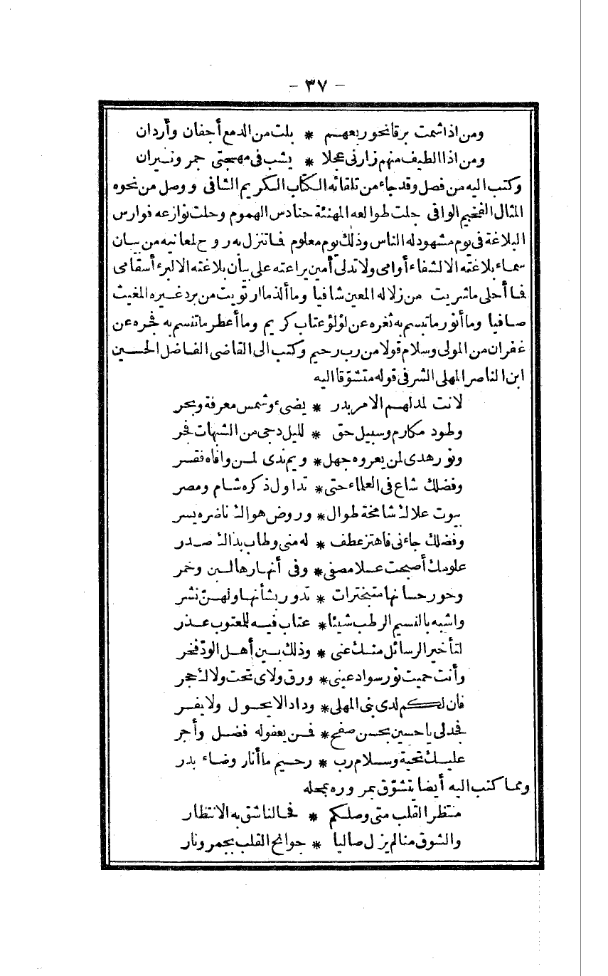 وَكتب إِلَيْهِ من فصل وَقد جَاءَ تلقائه الْكتاب الْكَرِيم الشافي وَوصل من نَحوه الْمِثَال الفخيم الوافي جلت طوالعه المهنئة حنادس الهموم وحلت نوارعه فوارس البالاغة فِي يَوْم مشهود لَهُ النَّاس وَذَلِكَ يَوْم مَعْلُوم فَمَا تنزل بِهِ روح لمعانيه من بَيَان سَمَاء البلاغه إِلَّا لشفاء أوامي وَلَا تدلى أَمِين يراعته على بَيَان بلاغته إِلَّا لبرئ أسقامي فَمَا أحلى مَا شربت من زلاله الْمعِين شافيا وَمَا أَلد مَا ارتويت من برد غَيره المغيث صافيا وَمَا أنور مَا تَبَسم بِهِ ثغره عَن لُؤْلُؤ عتاب كريم وَمَا أعطر مَا تنسم بِهِ فجره عَن غفران من الْمولى وَسَلام قولا من رب رَحِيم وَكتب إِلَى القَاضِي الْفَاضِل الْحُسَيْن ابْن النَّاصِر المهلى الشرفي فِي قَوْله متشوقا إِلَيْهِ