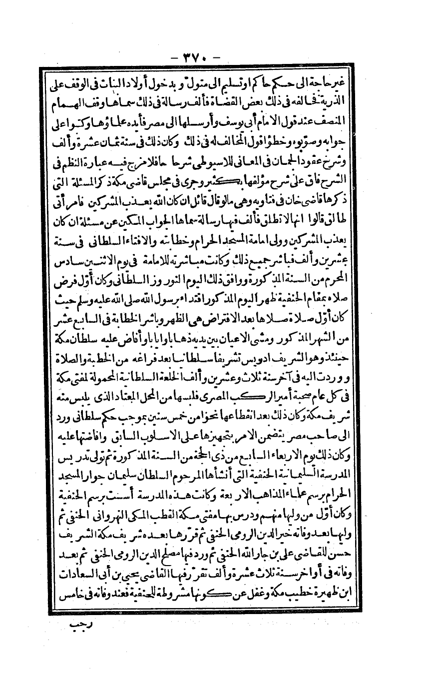 غير حَاجَة إِلَى حكم حَاكم أَو تَسْلِيم إِلَى متول وبدخول أَوْلَاد الْبَنَات فِي الْوَقْف على الذُّرِّيَّة فخالفه فِي ذَلِك بعض الْقُضَاة فألف رِسَالَة فِي ذَلِك سَمَّاهَا وقف الْهمام الْمنصف عِنْد قَول الإِمَام أبي يُوسُف وأرسلها إِلَى مصر فأيده علماؤها وَكَتَبُوا على جَوَابه وصوبوه وخطؤوا قَول الْمُخَالف لَهُ فِي ذَلِك وَكَانَ ذَلِك فِي سنة ثَمَان عشرَة وَألف وَشرح عُقُود الجمان فِي الْمعَانِي للأسيوطي شرحاً حافلاً مزج فِيهِ عبارَة النّظم فِي الشَّرْح فاق على شرح مؤلفها بِكَثِير وَجرى فِي مجْلِس قَاضِي مَكَّة ذكر المسئلة الَّتِي ذكرهَا قَاضِي خَان فِي فَتَاوِيهِ وَهِي مَا لَو قَالَ قَائِل إِن كَانَ الله يعذب الْمُشْركين فامرأتي طَالِق قَالُوا إِنَّهَا لَا تطلق فألف فِيهَا رِسَالَة سَمَّاهَا الْجَواب المكين عَن مسئلة إِن كَانَ يعذب الْمُشْركين وَولي إِمَامَة الْمَسْجِد الْحَرَام وخطابته والإفتاء السلطاني فِي سنة عشْرين وَألف فباشر جَمِيع ذَلِك وَكَانَت مُبَاشَرَته للْإِمَامَة فِي يَوْم الْإِثْنَيْنِ سادس الْمحرم من السّنة الْمَذْكُورَة وَوَافَقَ ذَلِك الْيَوْم النوروز السلطاني وَكَانَ أوّل فرض صَلَاة بمقام الْحَنَفِيَّة ظهر الْيَوْم الْمَذْكُور اقْتِدَاء برَسُول الله