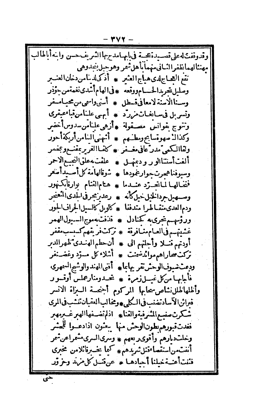 وَقد وقفت لَهُ على قصيدة عَجِيبَة فِي بَابهَا مدح بهَا الشريف حسن وَابْنه أَبَا طَالب مهنئاً لَهما بظفر الثَّانِي مِنْهُمَا بِأَهْل شمر وَهُوَ جبل بِنَجْد وَهِي
