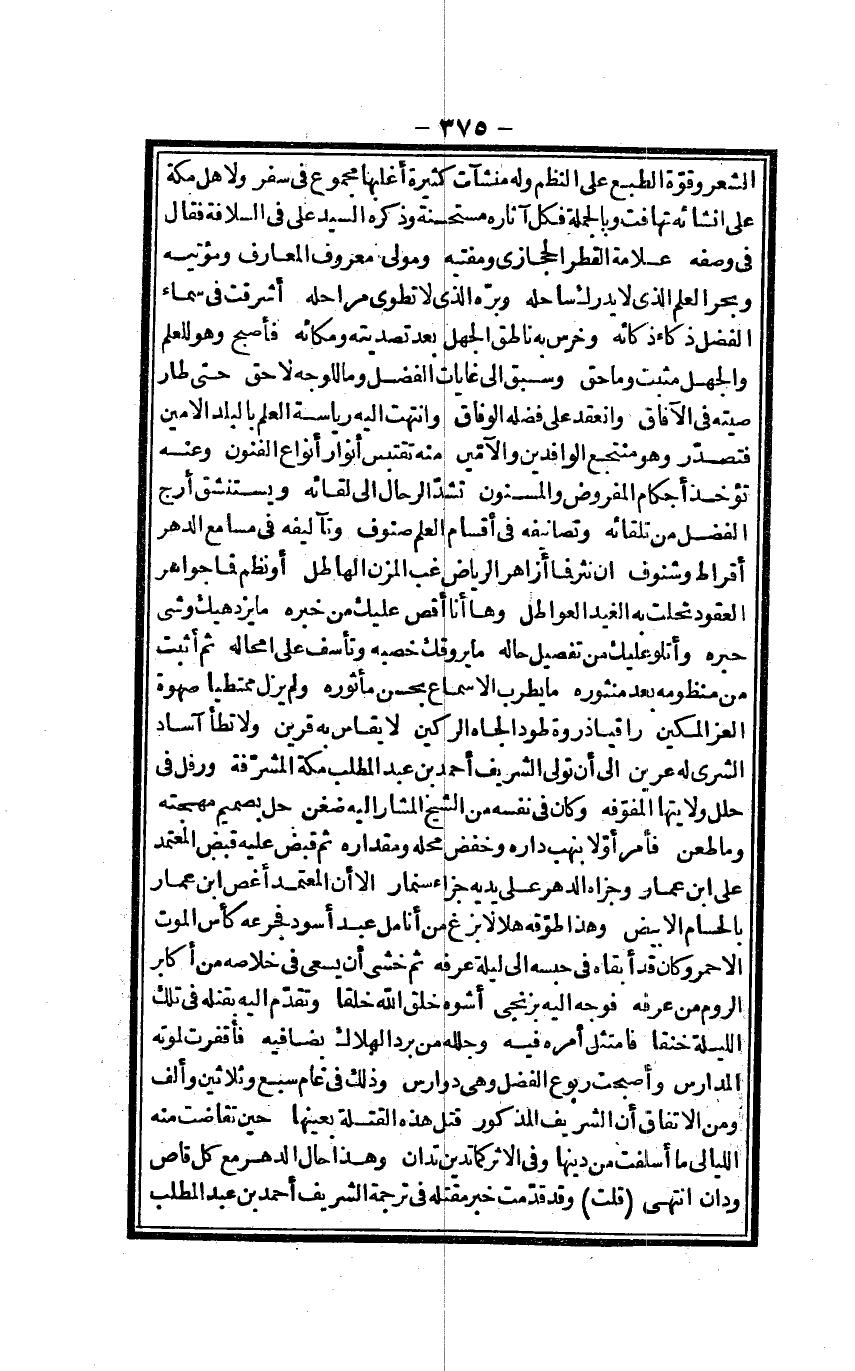 الشّعْر وَقُوَّة الطَّبْع على النّظم وَله منشآت كَثِيرَة أغلبها مَجْمُوع فِي سفر وَلأَهل مَكَّة على إنشائه تهافت وَبِالْجُمْلَةِ فَكل آثاره مستحسنة وَذكره السَّيِّد عَليّ فِي السلافة فَقَالَ فِي وَصفه عَلامَة الْقطر الْحِجَازِي ومفتيه وَمولى مَعْرُوف المعارف ومؤتيه وبحر الْعلم الَّذِي لَا يدْرك ساحله وبره الَّذِي لَا تطوى مراحله أشرقت فِي سَمَاء الْفضل ذكاء ذكائه وخرس بِهِ نَاطِق الْجَهْل بعد تصديته ومكائه فَأصْبح وَهُوَ للْعلم وَالْجهل مُثبت وماحق وَسبق إِلَى غايات الْفضل وَمَا للْوَجْه لَاحق حَتَّى طَار صيته فِي الْآفَاق وانعقد على فَضله الْوِفَاق وانتهت إِلَيْهِ رياسة الْعلم بِالْبَلَدِ الْأمين فتصدر وَهُوَ منتجع الوافدين والآمين مِنْهُ تقتبس أنوار أَنْوَاع الْفُنُون وَعنهُ تُؤْخَذ أَحْكَام الْمَفْرُوض والمسنون تشد الرّحال إِلَى لِقَائِه ويستنشق أرج الْفضل من تلقائه وتصانيفه فِي أَقسَام الْعلم صنوف وتآليفه فِي مسامع الدَّهْر أقراط وشنوف أَن نثر فَمَا أزاهر الرياض غب المزن الهاطل أَو نظم فَمَا جَوَاهِر الْعُقُود تحلت بِهِ الغيد العواطل وَهَا أَنا أقص عَلَيْك من خَبره مَا يزدهيك وشى حبره وأتلو عَلَيْك من تَفْصِيل حَاله مَا يروقك خصبه وتأسف على إمحاله ثمَّ أثبت من منظومه بعد منثوره مَا يطرب الأسماع بِحسن مأثوره وَلم يزل ممتطياً صهوة الْعِزّ المكين راقياً ذرْوَة طود الجاه الركين لَا يُقَاس بِهِ قرين وَلَا تطَأ آساد الشرى لَهُ عرين إِلَى أَن تولى الشريف أَحْمد بن عبد الْمطلب مَكَّة المشرفة ورفل فِي حلل ولايتها المفوفة وَكَانَ فِي نَفسه من الشَّيْخ الْمشَار إِلَيْهِ ضغن حل بصميم مهجته وَمَا طعن فَأمر أَولا بِنَهْب دَاره وخفض مَحَله ومقداره ثمَّ قبض عَلَيْهِ قبض الْمُعْتَمد على ابْن عمار وجزاه الدَّهْر على يَدَيْهِ جَزَاء سنمار إِلَّا أَن الْمُعْتَمد أغص ابْن عمار بالحسام الْأَبْيَض وَهَذَا طوقه هلالاً بزغ من أنامل عبد أسود فجرعه كأس الْمَوْت الْأَحْمَر وَكَانَ قد أبقاه فِي حَبسه إِلَى لَيْلَة عَرَفَة ثمَّ خشى أَن يسْعَى فِي خلاصه من أكَابِر الرّوم من عرفه فَوجه إِلَيْهِ بزنجي أشوه خلق الله خلقا وَتقدم إِلَيْهِ بقتْله فِي تِلْكَ اللَّيْلَة خنقاً فامتثل أمره فِيهِ وجلله من برد الْهَلَاك بضافيه فأقفرت لمَوْته الْمدَارِس وأصبحت ربوع الْفضل وَهِي دوارس وَذَلِكَ فِي عَام سبع وَثَلَاثِينَ وَألف وَمن الِاتِّفَاق أَن الشريف الْمَذْكُور قتل هَذِه القتلة بِعَينهَا حِين تقاضت مِنْهُ اللَّيَالِي مَا أسلفت من دينهَا وَفِي الْأَثر كَمَا تدين تدان وَهَذَا حَال الدَّهْر مَعَ كل قاص ودان انْتهى قلت وَقد قدمت خبر مَقْتَله فِي تَرْجَمَة الشريف أَحْمد بن عبد الْمطلب