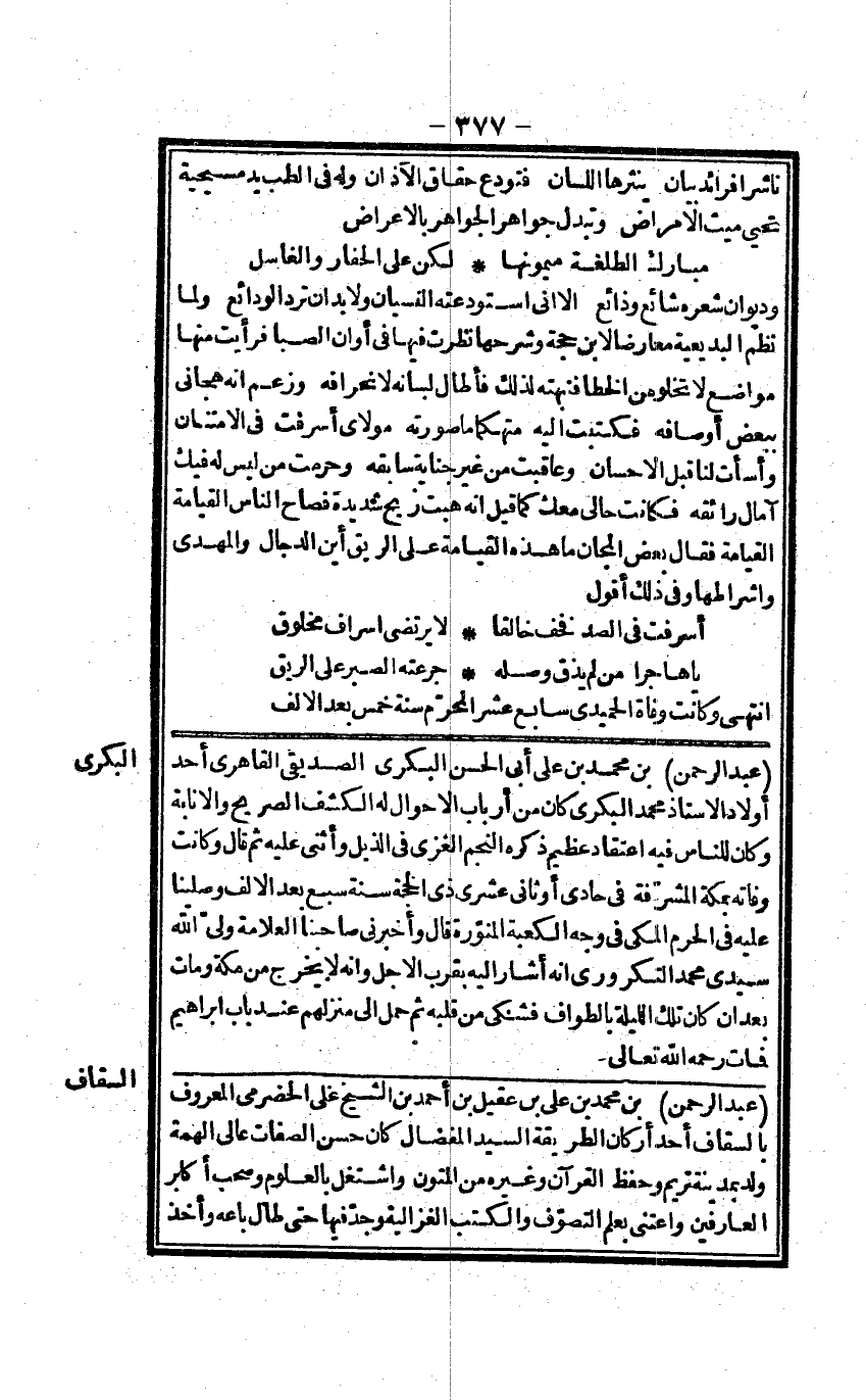 عبد الرَّحْمَن بن مُحَمَّد بن عَليّ أبي الْحسن الْبكْرِيّ الصديقي القاهري أحد أَوْلَاد الْأُسْتَاذ مُحَمَّد الْبكْرِيّ كَانَ من أَرْبَاب الْأَحْوَال لَهُ الْكَشْف الصَّرِيح والإنابة وَكَانَ للنَّاس فِيهِ اعْتِقَاد عَظِيم ذكره النَّجْم الْغَزِّي فِي الذيل وَأثْنى عَلَيْهِ ثمَّ قَالَ وَكَانَت وَفَاته بِمَكَّة المشرفة فِي حادي أَو ثَانِي عشرى ذِي الْحجَّة سنة سبع بعد الْألف وصلينا عَلَيْهِ فِي الْحرم الْمَكِّيّ فِي وَجه الْكَعْبَة المنورة قَالَ وَأَخْبرنِي صاحبنا الْعَلامَة ولي الله سَيِّدي مُحَمَّد التكروري أَنه أَشَارَ إِلَيْهِ بِقرب الْأَجَل وَإنَّهُ لَا يخرج من مَكَّة وَمَات بعد أَن كَانَ تِلْكَ اللَّيْلَة بِالطّوافِ فَشكى من قلبه ثمَّ حمل إِلَى منزلهم عِنْد بَاب إِبْرَاهِيم فَمَاتَ رَحمَه الله تَعَالَى